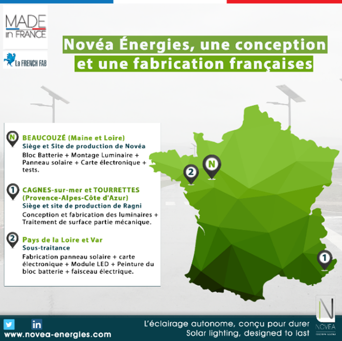 «L’éco-conception consiste à intégrer l’environnement dès la conception d'un produit ou service, et lors de toutes les étapes de son cycle de vie » (AFNOR, 2004). Novéa Énergies propose des produits éco-conçus aussi bien dans la fabrication que dans leur usage, car la recyclabilité seule d'un produit n'est pas suffisante pour limiter son impact environnemental. Un choix de matériaux engagé Parmi la grande famille des batteries Lithium-Ion, la technologie Lithium Fer Phosphate ne contient aucun métaux lourds et polluants. La batterie est composée de Lithium, de Sulfate de fer et de Carbone. De plus, les meilleurs rendements énergétiques de la batterie LifePO4 (Endurance+) permettent d’utiliser un panneau solaire moins puissant (-25%) pour stocker la même quantité d’énergie qu’une batterie NiMH par exemple, il est donc plus compact. Ce qui permettra une économie sur l’usage des ressources primaires pour la fabrication du panneau solaire. Recyclage Novéa Énergies travaille avec 3 éco-organismes pour gérer la collecte, le démantèlement et le recyclage de nos lampadaires solaires : Soren, Screlec et ecosystem. De plus, le taux de recyclage pour les batteries Lithium est en constante augmentation du fait de l’évolution des volumes et des avancées technologiques dans ce domaine. Le taux de recyclage actuel des panneaux solaires de Novéa Énergies est de 94,7% (source PV Cycle), de la batterie de 100% pour l’aluminium et 70% pour les cellules Lithium (source ADEME) et de 100% pour tous les autres composants (carte électronique, LED…). Le taux de recyclage d’un composant n’est pas le seul critère d’analyse à prendre en compte. Il faut tenir compte de l’usage global sur une durée de vie attendue. Technologie la plus durable Novéa Énergies offre la meilleure durée de vie du marché, supérieure à 20 ans. Cela est possible grâce à la technologie performante Endurance+ et à l’absence de décharge profonde. Sur 20 ans, les ensembles Novéa Énergies ne demandent pas de changements de composants contrairement à d’autres technologies qui offrent par exemple une durée de vie de 10 ans. L’usage global sur la durée de vie du produit est donc largement réduit, et la fabrication de nouveaux équipements limitée. La batterie LiFePO4 génère ainsi 50% de déchets ultimes en moins que le NiMH pour une même quantité d’énergie stockée. Les déchets ultimes sont ceux qui ne sont plus valorisables ni par le recyclage ni par la valorisation énergétique. Économies d’Énergie Les lampadaires solaires de Novéa Énergies sont programmés sur-mesure, au plus près du besoin du client afin de limiter des périodes d’éclairage inutiles. Ainsi, il est courant que les lampadaires solaires s’allument à des plages horaires précises et s’éteignent le reste de la nuit où aucune activité ni passage ne sont prévus. La mise en veille à un certain pourcentage d’énergie peut également être prescrite, selon les applications, souvent en complément d’un détecteur de présence qui permettra d'éclairer le lieu uniquement lors du passage d'un usager. De plus, les panneaux solaires étant dimensionnés au plus juste, les ressources primaires sont ainsi limitées. La sous-traitance locale favorisée Novéa Énergies, s’est donné comme mission de produire et concevoir ses lampadaires solaires majoritairement en France. Ce sont en tout 7 entreprises françaises impliquées dans la fabrication de nos ensembles, avec notamment notre maison mère Ragni ou encore un atelier protégé. Pour conclure, Novéa Énergies intègre parfaitement la notion d’éco-conception et d’éco fonctionnalité sur tous les aspects de ses solutions pour limiter son impact sur l’environnement : usage des ressources primaires limitées à la conception, filière de recyclage en place, grande durabilité des ensembles mais aussi économie d'énergie.