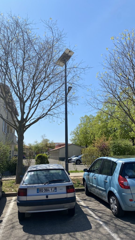 Le village de Solaize est situé à 15km au sud de Lyon et appartient notamment à la Vallée de la Chimie. Cette commune offre ainsi un écrin de verdure, doublé d’un véritable intérêt pour la recherche d’économie d’énergie. Et cela se traduit par plusieurs projets solaires réalisés avec Novéa Energies, dont le dernier, l’installation de 8 candélabres solaires sur le parking de l’école. C’est le Syndicat de gestion des énergies de la région lyonnaise qui a mené à bien ce projet. La volonté de la commune et du syndicat était de « valoriser cet espace urbain par un mobilier à énergie renouvelable » comme l’explique Mr Mouyon, technicien référent. Ce projet environnemental a ainsi permis des économies d’énergies tout en s’intégrant dans une démarche d’aménagement extérieur. L’éclairage portait sur le parking d’une part, et le chemin piéton longeant le gymnase et menant à l’école d’autre part. Le tout dans un cadre arboré. Pour répondre au mieux à ces deux applications, tout en prenant en compte la végétation présente sur le site, Novéa Energies a proposé un ensemble de plusieurs modèles. Sur le parking, on retrouve 2 Combi Top 2 pour éclairer en simple crosse, et 3 Combi top 5 pour éclairer en double crosse. Ces lampadaires solaires proposent des mâts de 7.6m avec une hauteur de feu de 5m. Ainsi, les panneaux sont assez hauts pour produire l’énergie nécessaire malgré la végétation, et les luminaires, plus bas, éclairent efficacement au sol. Les modèles sont harmonisés avec un RAL 2900 sablé ainsi que des consoles St Maxime et des luminaires Griff S de la société Ragni. La seule différence se trouve dans leur performance, la simple crosse propose un panneau de 120Wc et une batterie de 532Wh et les double crosses sont composées d’un panneau de 310 Wc avec une batterie de 1064Wh. Dans l’allée piétonne, on retrouve 3 Combi Top 3 soit un panneau de 185 Wc avec une batterie de 696 Wh. Le mât est ici d’une hauteur de 5,6m, car il est plus éloigné des arbres. Ce candélabre autonome est également composé du luminaire Griff S, qui est exclusivement disponible en solaire chez Novéa Energies, filiale du groupe Ragni. Enfin, le RAL est là aussi du 2900 sablé, pour se fondre dans le décor. Le parking est fréquenté pour déposer et récupérer les enfants à l’école, mais également pour l’utilisation du gymnase. Tous ces candélabres autonomes ont donc un fonctionnement qui repose sur de la détection de présence. Ils restent en veille à 10% tout au long de la nuit, et passe à 100% de l’éclairage pendant 45 secondes à chaque détection, grâce à leur détecteur SIR de Lacroix City installés sur leur mât. Ce beau projet a été installé en Mars 2021. Le syndicat a apprécié l’offre de Novéa, et a trouvé l’installation de ces candélabres solaires plutôt simple. À la suite de l’installation, les retours sont très positifs, « les lampadaires s’intègrent bien et le résultat photométrique avec les luminaires Ragni est parfait », témoigne Mr Mouyon. Informations supplémentaires : Modèle COMBI TOP 2 / COMBI TOP 3 / COMBI TOP 5 Hauteur de feu 5 m et 7 m RAL 2900 sablé Luminaire Griff S Durée de vie > 100 000 h à 80 % du flux Panneau solaire 120 Wc / 185 Wc / 310 Wc Durée de vie > 25 ans Technologie et capacité batterie ENDURANCE + TECHNOLOGY 532 Wh / 696 Wh / 1064 Wh Durée de vie > 20 ans Garantie 10 ans
