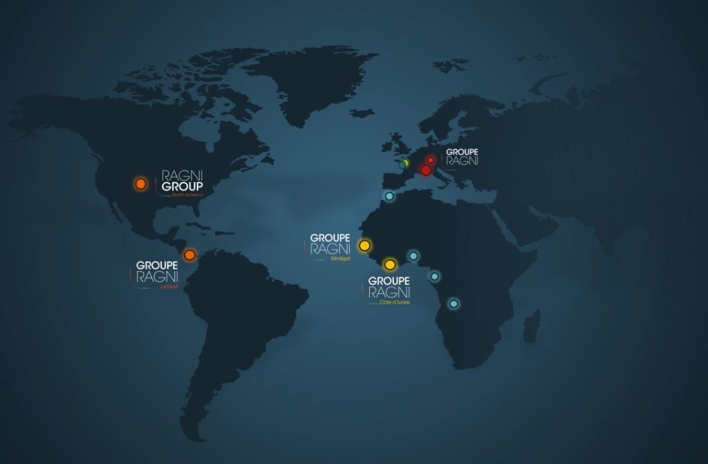 In Westafrika hat die GROUPE RAGNI 2 Tochtergesellschaften mit Sitz in Abidjan und Dakar sowie Repräsentanzen in Marokko, Gabun, Benin und Angola eröffnet. Auch in Lateinamerika und in den Vereinigten Staaten gibt es 2 Tochtergesellschaften. Die GROUPE RAGNI hat auch ihre Präsenz in Europa und in Deutschland durch die Übernahme der Hess GmbH Licht + Form mit Sitz in Villingen-Schwenningen verstärkt.