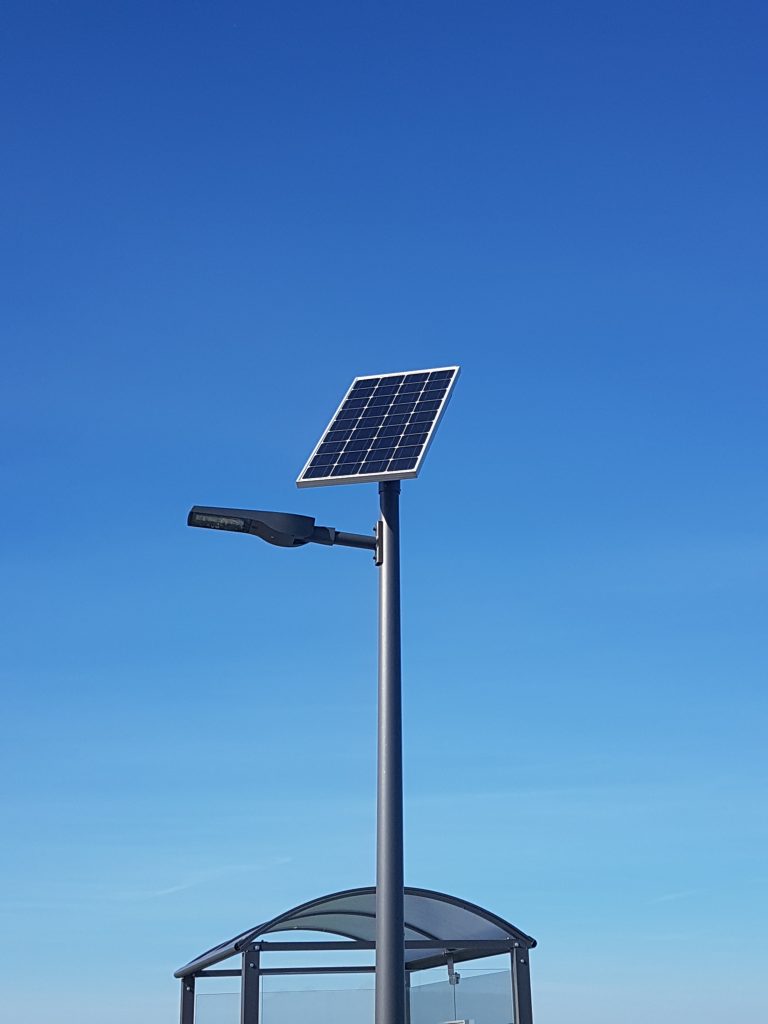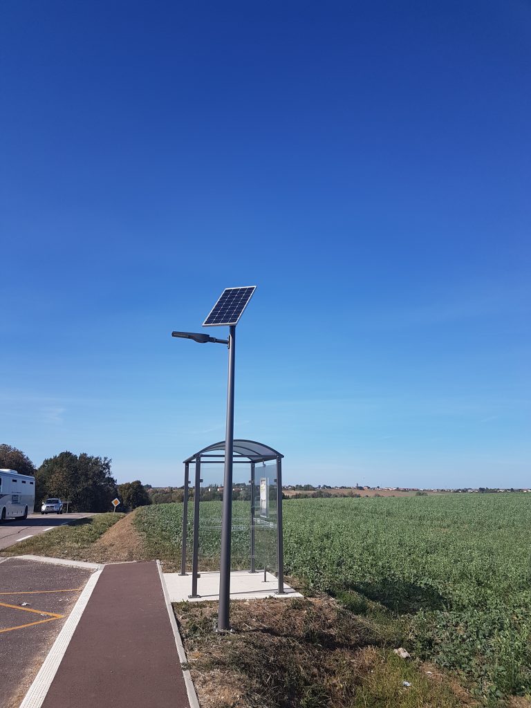 The stop for travelers of Courcelles-sur-Nied, in the department of Moselle (57), is now lit by an autonomous street light Novéa Énergies. The installed street lamp is a COMBI TOP 2 with a 100 Wp solar panel, a TEKK S luminaire and a 704 Wh battery. The quality lighting that it offers brings a non-negligible comfort to the users of the bus stop. The lighting provides a sense of security for users waiting for public transport, and facilitates the work of the bus driver, who can easily see people at the bus stop. This lamp is triggered at dusk to illuminate in full power for three hours, before switching to lowering mode to 5% during the rest of the night. The two hours before dawn, the solar street lamp returns to full power before going out for the day. A light failure is scheduled from 11:00 PM to 05:00 AM, during which time the bus stop is not frequented. The choice of the autonomous for this isolated bus stop has avoided heavy civil works (trench, track repair) and network installation. In traditional wired electrical solution, the connection to the electrical network would have been expensive. A concrete block was sufficient for anchoring to the ground. The integration of this energy-autonomous lighting solution has therefore facilitated installation work and reduced the investment cost. Public lighting powered by solar energy is also an ecological solution because it allows to limit the environmental impacts by offering an alternative to the consumption of fossil and polluting energies. In addition, the operation of these solar street lamp post does not involve any electric subscription to the energy supplier, and thus allows to limit expenses. Additional Information : Model COMBI TOP 2 Luminaire : TEKK S Solar panel: 100 Wc Fire height: 4.0 m Technology and battery capacity: ENDURANCE + TECHNOLOGY 704 Wh Bracket : Saint Luc RAL 2900 Shortbread