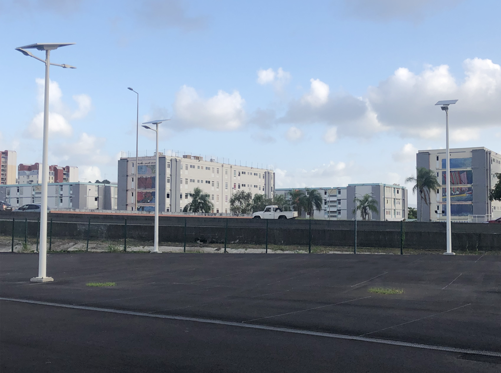 The Eole car park in Fort de France, Martinique (972) is now lit by seventeen Novea Energies solar street lamps. These street lamps are all COMBI TOP 5 with TEKK M luminaire with a seven meters light height, equipped with a 260 Wp solar panel and a 1,064 Wh battery located in a box under the solar panel. Of these, nine are single-bracket and eight are double-brackets to illuminate two sections of parking spaces, thus limiting the duplication of lampposts. These solar sets illuminate the parking spaces in the car park to provide safety and comfort to users. Autonomous lighting powered by solar energy is a sustainable choice because it limits environmental impacts by offering an alternative to the consumption of fossil fuels and polluting energy. Being completely autonomous, these streetlights do not require any subscription to an electricity supplier. Easy to install, only a concrete block is needed to anchor them to the ground, without any other heavy work (trench, track repairs, etc.). The 1,064 Wh battery and the energy management system of this streetlight allow the lighting to be adapted as required, thus limiting light pollution. As the traffic and traffic on this car park is concentrated in the early hours of the night, the luminaires only illuminate at full power during the first five hours after dusk. A watch is then triggered (25% for single-bracket lampposts and 20% for double-bracket lampposts) to mark out the premises, combined with a presence detection system that raises the lighting power to 100% when a user is detected. Novéa lampposts are equipped with batteries with Endurance+ technology, which, thanks to its Lithium LiFePO4 cells and its unique energy flow management, offers the best life expectancy on the market. Seven years of R&D (in partnership with the CEA in Grenoble) and industrialization have enabled us to develop and perfect this unique battery, scientifically recognized as the most efficient and best adapted to the solar street lighting market. Further information : Model COMBI TOP 5 Luminaire: TEKK M (9 Single bracket and 8 Double brackets) Solar panel : 260 Wp Light height : 7.0 m Technology and battery capacity: ENDURANCE + TECHNOLOGY 1,064 Wh Bracket: Saint Luc 70 (9 Single bracket and 8 Double brackets) RAL 9002 (Grey white)