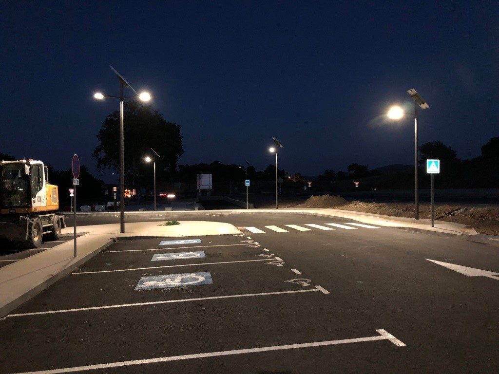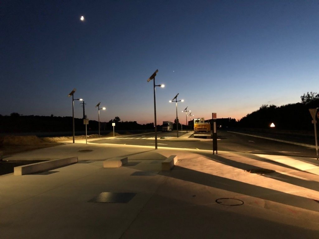 The Departmental Council of Aude and the city of Béragne opted for Novea Energies solar street light to secure a car-pool parking.Five COMBI TOP 2 with a 100 Wp solar panel with TEKK luminaire and three COMBI TOP 3 double butts equipped with a 160 Wp solar panel combined with a TEKK luminaire were installed simply, without carrying out heavy road works. In traditional wired electrical solution, the connection to the electrical network would have been expensive.These street lamps provide quality lighting throughout the night, in this isolated area. They are equipped with a 10% vigil system from dusk to dawn, as well as a presence detection device over a defined time period. The standby mode allows the parking to be marked so that it is seen and remains welcoming, and the full power mode by infrared presence detection offers maximum comfort at any time of the night for users, while limiting energy consumption. This management offers our solar lamps a great autonomy and a long service life of battery The installation of these autonomous lamp posts has avoided heavy civil engineering work (trenching, road rehabilitation) and the establishment of a network. A concrete block is sufficient for anchoring on the ground. The integration of this energy-autonomous lighting solution has therefore facilitated installation work and limited investment. Additional Information : Model COMBI TOP 2 Luminaire : TEKK S Solar panel: 100 Wc Light height: 5.0 m Technology and battery capacity: ENDURANCE + TECHNOLOGY 345 Wh Bracket : St Luc RAL: 2900 Model COMBI TOP 3 double butt Luminaire : TEKK S Solar panel: 100 Wc Light height : 6.0 m Technology and battery capacity: ENDURANCE + TECHNOLOGY 819 Wh Bracket : St Luc RAL: 2900