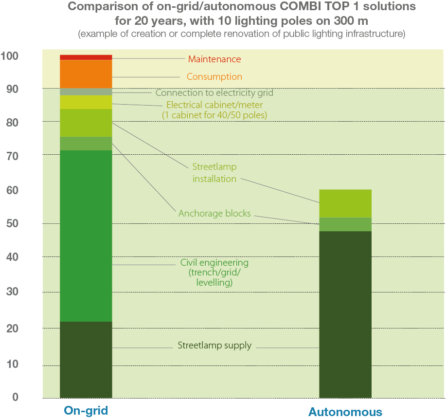 Concerned with meeting its clients’ expectations, Novéa Energies reached to propose a solar streetlamp more economical, but still autonomous, easy to install and respectful of the environment. This lamp post is conceived for many applications needed by local authorities, social housing landlord, or property developers: pedestrian paths, residential areas, bus stops,… And it also offers various personalisation to be adapted to each project. Combi Top 1: public lighting for everyone This solar solution is the entry-level model, to make not only solar solutions but also public lighting affordable. Solar lighting is more and more requested for economical issues due to technical constraints. Combi top 1 is the perfect solution with an easy implementation and savings until 40% compared to a traditional on-grid solution. It has an attractive purchase price, and much more. As our other solutions, its installation is fast and doesn’t need civil engineering (trench, grid…) and its operating doesn’t require an energy subscription. Also, this product offers the same service life (cf. table) than our other products, which ensure a very limited maintenance, making it ultra-competitive. Still with the respect of local environment thanks to reduced construction, and protected raw materials thanks to a reasoned use and a mastered recycling. Here is an example of savings on global cost with a COMBI TOP 1 compared to an on-grid solution: Combi Top 1: an optimised power So how can we propose this economical product? Just by simplifying all the components, to perfectly size a solar streetlamp to applications with low energy consumption and to design a compact and aesthetic solution. With its panel of 60 Wp, and its battery ENDURANCE + of 214 to 428 Wh (developed by the CEA of Grenoble), this solution was conceived for residential areas, bus stops, small parking, pedestrian paths or bicycle paths. In most cases, these applications do not need a permanent lighting which enables to limit energy consumption. COMBI TOP 1 is sized precisely to meet their needs, and it limits energy loss and luminous pollution. Combi Top 1: a tailor-made solution So it is the combination of an optimised conception with a precise sizing that make Combi top 1 very attractive, and materials are the same, with the same quality. This product is manufactured on our site at Beaucouzé in Maine-et-Loire (France), so the delivery is fast. And we have a large choice of personalisation with many of our programs accessible: presence detectors, dimming mode, operating according to dusk or dawn, … You can also put on your autonomous pole our NOVMOOV solution, to light several lamps at the same time. And you still choose the RAL of you lighting furniture, so it will vanish on the environment! You also have the possibility to replace your existent public lighting and keep your traditional pole at top 60mm (depending on its state and except in areas 4 and 5 according to EN40), by adding only the top part of our solution. So it is by meeting precisely your requirements that we can propose a price as closely as possible to your budget, keeping the quality and the ultra-personalisation which characterise our products! Further Information: Model COMBI TOP 1 Light height 3.5 m to 6.0 m RAL Your choice Luminaire Tailor-made lamp for COMBI TOP 1 Service life: 100 000 h at 80 % of the flux Solar panel 60 Wp Service life: 25 years at 80 % of the initial power peek Technology and capacity of the battery ENDURANCE + TECHNOLOGY 214 Wh or 428 Wh Service life > 12 years Warranty 5 years Documentation : COMBI TOP 1 EN