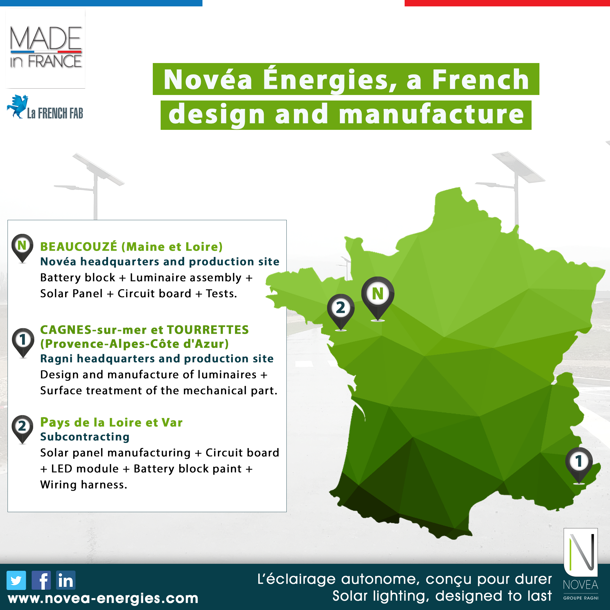 "Eco-design consists of integrating the environment from the design of a product or service, and during all stages of its life cycle" (AFNOR, 2004). Novéa Énergies offers eco-designed products both in manufacturing and in their use, because the recyclability of a product alone is not sufficient to limit its environmental impact. A committed choice of materials Among the large family of Lithium-Ion batteries, Lithium Iron Phosphate technology does not contain any heavy metals and pollutants. The battery is made up of Lithium, Iron Sulphate and Carbon. In addition, the better energy yields of the LifePO4 battery (Endurance+) make it possible to use a less powerful solar panel (-25%) to store the same amount of energy as a NiMH battery for example, so it’s more compact. Which will save on the use of primary resources for the manufacture of the solar panel. Recycling Novéa Énergies works with 3 eco-organisations to manage the collection, dismantling and recycling of our solar lighting solutions: Soren, Screlec and ecosystem. In addition, the recycling rate for Lithium batteries is constantly increasing due to the evolution of volumes and technological advances in this sector. The current recycling rate for Novéa Énergies solar panels is 94.7% (source PV Cycle), for the battery 100% for aluminum and 70% for Lithium cells (source ADEME) and 100% for all the other components (controller, LED, etc.). The recycling rate of a component is not the only analysis criterion to take into account. It’s necessary to take into account the overall use over an expected lifespan. Most sustainable technology Novéa Énergies offers the best lifespan on the market, over 20 years. This is possible thanks to the high-performance Endurance+ technology and the absence of deep discharge. Over 20 years, Novéa Énergies sets do not require component changes, in contrary to other technologies which, for example, offer a lifespan of 10 years. The overall use over the life of the product is therefore greatly reduced, and the manufacture of new equipment limited. The LiFePO4 battery thus generates 50% less ultimate waste than NiMH for the same amount of stored energy. The ultimate waste is that which can no longer be recovered either through recycling or energy recovery. Energy savings Novéa Énergies solar lightings solutions are programmed as closely as possible to the customer's needs in order to limit unnecessary lighting periods. Thus, it’s common for solar lighting solutions to turn on at specific time slots and turn off the rest of the night when no activity or passage is planned. Dimming mode at a certain percentage of energy can also be prescribed, depending on the application, often in addition to a motion sensor which will illuminate the place only when a user passes. In addition, solar panels are sized as accurately as possible, primary resources are thus limited. Local subcontracting favored Novéa Énergies has given itself the mission of producing and designing its solar lighting solutions, mostly in France. There are a total of 7 French companies involved in the manufacture of our sets, with in particular our parent company Ragni or a sheltered workshop. To conclude, Novéa Énergies perfectly integrates the notion of eco-design and eco-functionality into all aspects of its solutions to limit its impact on the environment: use of primary resources limited to design, recycling industry in place, great durability of the sets but also energy saving.