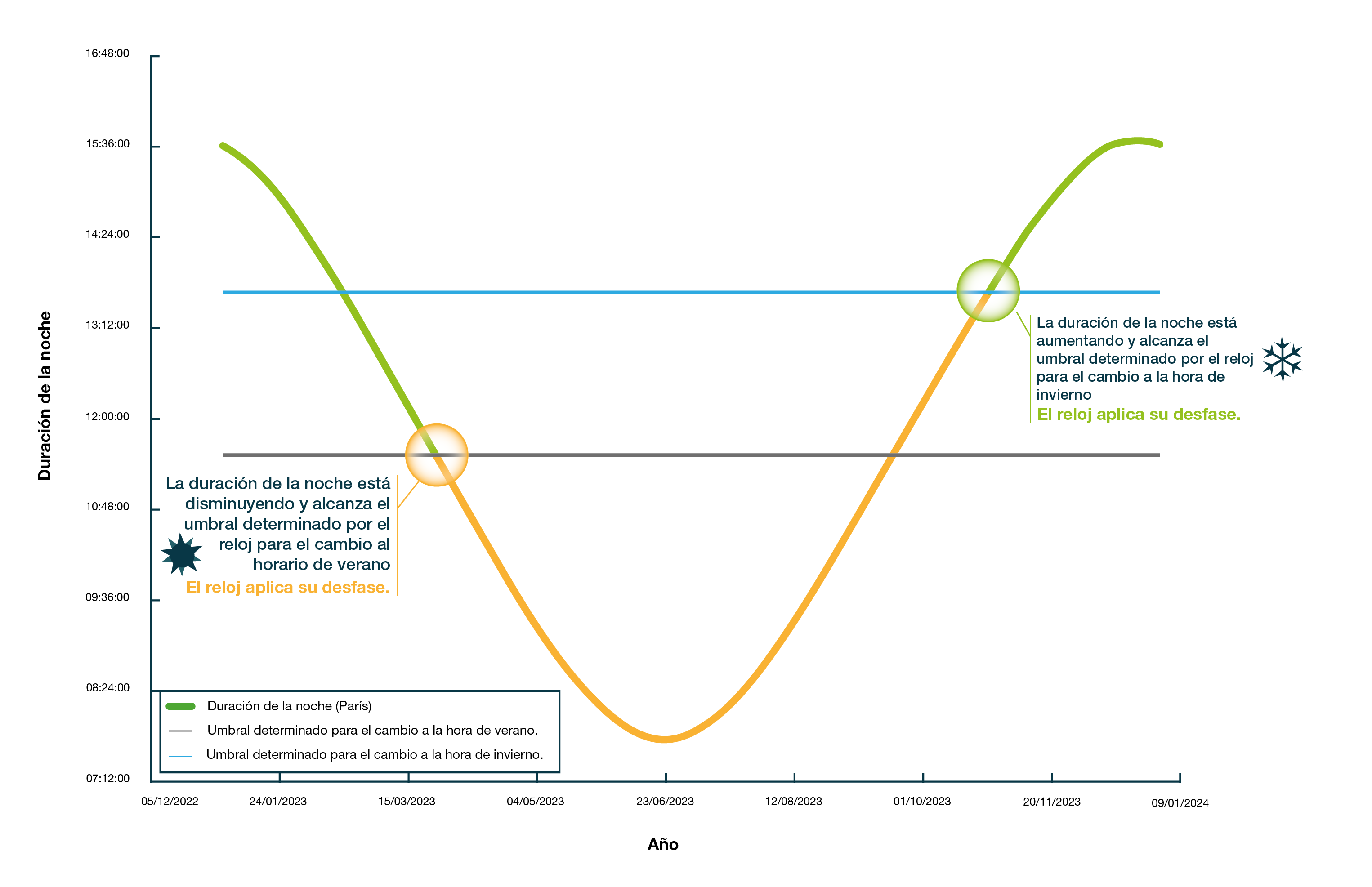 El funcionamiento de nuestras farolas solares está intrínsecamente ligado a la salida y la puesta del sol; la farola se enciende cuando el panel solar deja de recibir luz. Sin embargo, el principio y el final de la noche cambian continuamente, por no hablar de los dos cambios de horario que se producen en Europa y en algunas partes del mundo. En este caso, ¿cómo se puede garantizar que la luminaria ilumine durante todo el año según una programación adaptada al uso requerido? 2 tipos de programación de iluminación posible Para todos sus productos, Novéa Energies propone una gestión de la iluminación optimizada y adaptada a las necesidades de los clientes y usuarios gracias a la integración de una etiqueta de programación adaptada a medida, cuyo consumo energético se ajusta al modelo propuesto y su lugar de instalación. Novéa ofrece dos sistemas de programación de la iluminación : la programación tempo y la programación horaria. La programación tempo, definirá la encendido, apagado o suspensión de la luminaria a partir de una duración de iluminación predefinida en función del anochecer y/o el amanecer. Ejemplo con el cronograma siguiente: La farola se enciende al 100% 2 horas después del anochecer y 1hora y media antes del amanecer, sin tener en cuenta una hora concreta. La programación tempo depende de la variaciones de la duración de la noche, y en particular de la hora de la media noche a lo largo del año. Este periodo intermedio evolucionará en función de las estaciones, especialmente en las zonas geográficas alejadas del ecuador, donde las noches son más cortas en verano y más largas en invierno. Ejemplo con este programación : Un Combi Top 2, instalado en la región de Nantes (Francia) fue programado para encenderse durante 3 horas después del atardecer, apagarse completamente al cabo de 3 horas y volver a encenderse 2 horas antes del amanecer. En invierno, el atardecer es a las 17:00 y el amanecer a las 8:30 (aproximadamente): la farola se apagará alrededor de la 20:00 y se volverá a encender a las 6:30. Al revés, en verano, el atardecer comienza a las 22:30 y el amanecer a las 6:30: la farola se apagará alrededor de la 1:30 de la madrugada y se volverá a encender a las 4:30. Escenario de iluminación en diciembre Escenario de iluminación en junio Por lo tanto, la iluminación variará en función de las estaciones lo que puede provocar une programación inadecuada para las expectativas de los usuarios. La programación horaria, por su parte, definirá el encendido y el apagado en función de un horario determinado, independiente de la época del año o la duración de la noche. A la diferencia de los relojes programables utilizados en el alumbrado público conectado a la red, el sistema autónomo NOVEA no conoce el hora ni la fecha del día. El algoritmo se basará entonces en dos parámetros, identificados según la ubicación de la farola solar y los datos de las noches anteriores registrados por el sistema: La duración de la noche El punto medio de la noche La hora del punto medio de la noche cambia según el lugar y la estación del año; por eso, el algoritmo y la configuración desarrollados por Novéa Energies permiten encender y apagar los productos con una precisión de 15 minutos a lo largo de todo el año. Ejemplo con esta programación: la farola solar está programada para apagarse completamente a las 21:00 y volver a encenderse a las 7:00. En invierno, cuando el crepúsculo empieza a las 17:00 y el amanecer a las 8:30, la farola podrá aplicar el programa definido por el sistema. En verano, en cambio, con la noche cayendo a las 22:30 y el amanecer a las 6:30, la farola quedará apagada durante toda la noche, ya que el crepúsculo llega después de las 21:00 y el amanecer antes de las 7:00. ¡Es bueno saberlo!💡 El reloj se crea gracias a un algoritmo integrado en nuestra tarjeta electrónica NOVEMS y, por lo tanto, no genera un consumo eléctrico adicional: la energía producida por el panel solar durante el día y almacenada en la batería solo se utiliza para la iluminación. Cualquiera que sea el tipo de programación elegido, es importante dimensionar correctamente el programa en función del uso y tener en cuenta las variaciones y la precisión del sistema. Nuestra oficina de diseño especializada le acompañará en la expresión de sus necesidades para ofrecerle la mejor solución técnica para su proyecto. ¿Cómo se adaptan las farolas solares a los cambios horarios ? Aunque nuestras farolas están dimensionadas para adaptarse a las diferentes duraciones de la noche a lo largo del año, también deben responder a las necesidades y características externas inherentes a la actividad humana, como el cambio horario, que se aplica en Europa y en algunos países del mundo. La programación horaria permite tener en consideración las limitaciones relacionadas con el cambio horario. Como se ha mencionado más arriba, el reloj integrado en la tarjeta electrónica presente en la NOVBOX de cada farola permite analizar el comportamiento de las noches anteriores para determinar, a partir de los datos pregrabados, si las noches están en fase creciente (del 21 de junio al 21 de diciembre), o decreciente (del 21 de diciembre al 21 de junio). El reloj aplica su desfase cuando detecta una duración de la noche equivalente al umbral de cambio determinado para el cambio horario. La integración del cambio horario puede producirse antes o después de la fecha oficial del cambio de hora ya que sigue dependiendo de la duración de la noche. Hay que tener en cuento que el sistema tarda una semana en ajustarse, a diferencia de un reloj programable convencional. Para más información, descubra la experiencia de Novéa Energies.