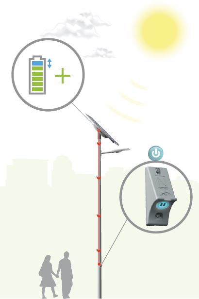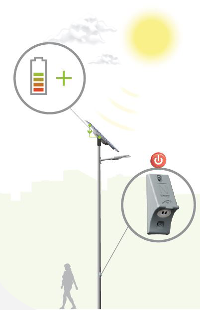 Una vez que la batería está completamente cargada, el exceso de energía producida por los paneles solares alimenta el módulo USB. Una luz de fondo azul indica la disponibilidad del servicio.