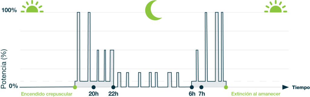 La programación permite iluminar simplemente adaptando el programa al uso y tránsito del eje, pero también limitar la contaminación lumínica, así como el tamaño de los candelabros, y por tanto el uso de recursos primarios.