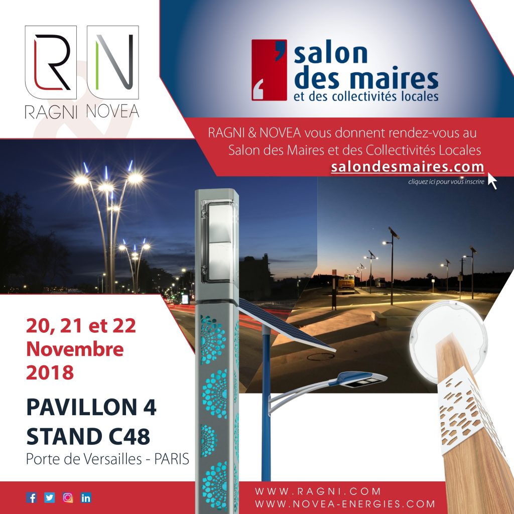 Venez rencontrer Novea Énergies et Ragni au salon des Maires et des Collectivités Locales, du 20 au 22 novembre à Paris. Rendez-vous Hall 4, Stand C48 pour découvrir ou redécouvrir nos candélabres autonomes !L’édition 2018 du Salon des Maires et des Collectivités Locales se déroulera les 20, 21 et 22 novembre à Paris, en parallèle du 101èmecongrès des Maires. Ce rendez-vous national réunit les grands acteurs de la commande publique avec l’ensemble de leurs partenaires institutionnels ou spécialisés dans la gestion, les services, l’aménagement et le développement des collectivités territoriales.Une fois n’est pas coutume, Ragni et Novéa Energies s’installent cette année dans le Hall 4, Stand C48. Renseignez le formulaire d’inscription pour obtenir votre entrée !