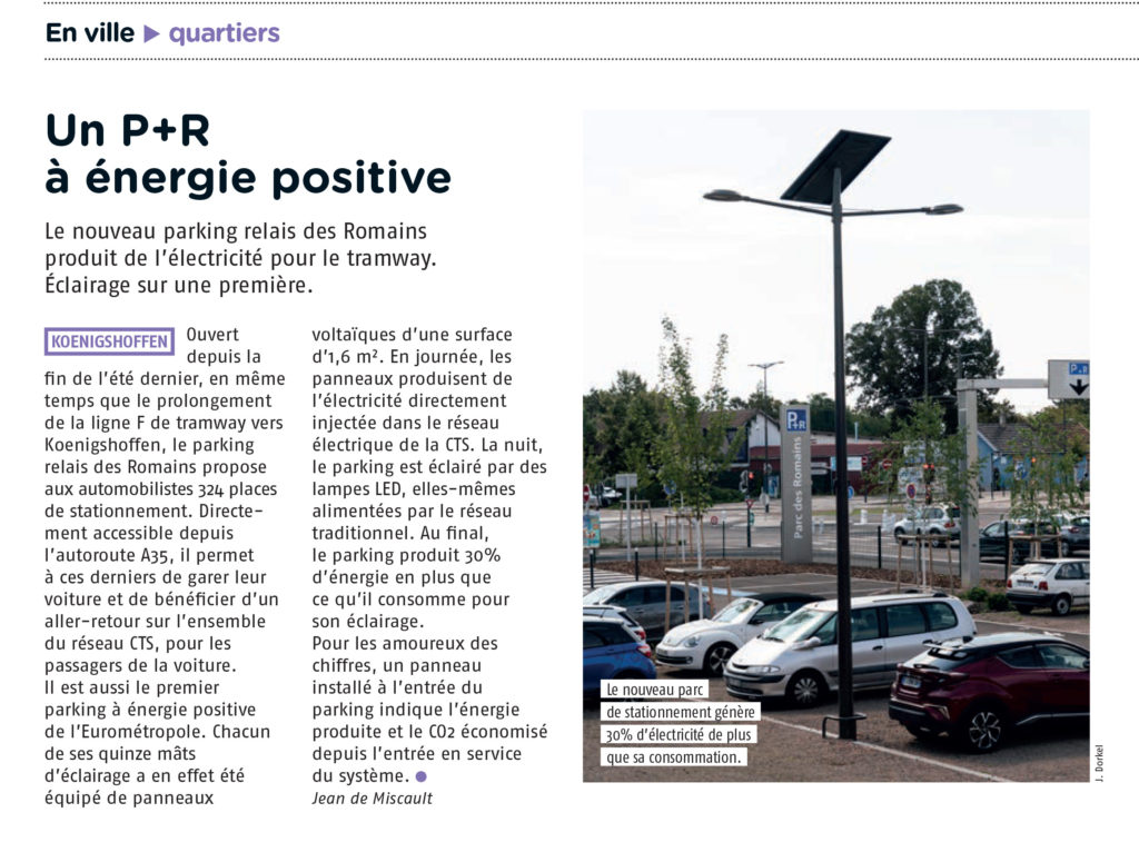 Ce magazine réalise 10 numéros par an pour informer les habitants sur les actualités de la ville. Il est distribué dans la ville de Strasbourg, mairies de quartier, institutions culturelles et 120 points de distribution. Pour son premier numéro de 2021, il propose un article sur notre solution ENOA installée au Parc des Romains, le parking relais du tramway. Cet article explique le fonctionnement de cette solution d'éclairage public à énergie positive qui, grâce à un dimensionnement adéquat, produit plus d’énergie que ce qu’elle consomme et alimente le réseau. Retrouvez plus d'informations dans l’article ci-dessous :
