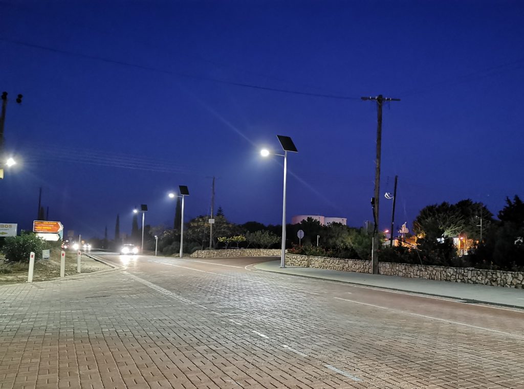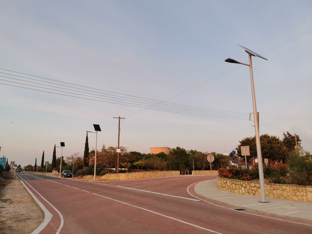 Au sud-est de Chypre, à Xylotimbou, un village du district de Larnaca, le carrefour de la route principale (E303) est éclairé grâce à l’énergie solaire. Les usagers peuvent ainsi emprunter cette route à toute heure de la nuit, en toute sécurité. La route européenne 303 est éclairée par des lampadaires solaires Novéa. Cet éclairage permet l’utilisation de cette avenue en toute sécurité à la nuit tombée. Longue de plusieurs dizaines de kilomètres, la E303 est pourvue de 11 COMBI TOP 5 qui assurent le confort et la sécurité des usagers. L’installation comporte donc 11 ensembles COMBI TOP 5 d’une hauteur de feu de sept mètres, équipés d’un luminaire GRIFF XL, et dotés d’un panneau solaire de 260 Wc et d’une batterie de 1 064 Wh. L’intégralité de ces points lumineux s’allument au crépuscule et éclairent en pleine puissance durant quatre heures. Le reste de la nuit, lorsque la fréquentation est moindre, le balisage de la route est assuré grâce à une veille des luminaires à 30 % de la pleine puissance. Ce mode abaissement qui s’enclenche lorsque le besoin est restreint, permet d’offrir un éclairage adapté et de prolonger la durée de vie des composants du candélabre, tels que la batterie et le luminaire. Les candélabres Novéa sont équipés de batteries dotées de la technologie Endurance+, qui permet, grâce à ses cellules au Lithium LiFePO4 et à sa gestion unique des flux d’énergie, d’offrir la meilleure durée de vie du marché. Ce sont sept années de R&D (en partenariat avec le CEA de Grenoble) et d’industrialisation qui nous ont permis de développer et mettre au point cette batterie unique, reconnue scientifiquement comme la plus performante et la mieux adaptée au marché de l’éclairage public solaire. Les lampadaires solaires sont complètement autonomes, ils ne nécessitent donc aucun raccordement au réseau, contrairement à l’éclairage traditionnel qui demande de lourds travaux, qui auraient pénalisés la circulation de cette voie très empruntée. Leur installation est simple, car seul un massif en béton suffit pour l’ancrage au sol. Aucun abonnement à un fournisseur d’électricité n’est requis, mais ils offrent un éclairage constant et de qualité grâce au gisement solaire du pays et à une technologie de stockage de l’énergie de grande qualité. L’autonome solaire dispose également d’un avantage écologique, car il s’agit d’une solution alternative à la consommation d’énergies fossiles. Le recours à une solution autonome à énergie solaire permet de limiter les impacts environnementaux de l’éclairage public. Informations supplémentaires : Modèle autonome COMBI TOP 5 Luminaire : GRIFF XL Crosse : St Luc 70 Panneau solaire : 260 Wc Hauteur de feu : 7 m Technologie et capacité batterie : ENDURANCE + TECHNOLOGY 1 064 Wh RAL 9006 aluminium blanc