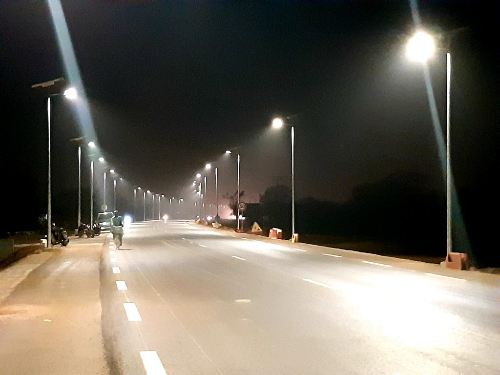 La route nationale n°4 (RN4), à l’est du Burkina Faso, a été totalement réaménagée. Les usagers subissaient quotidiennement l’état de dégradation de cette infrastructure, ce n’est aujourd’hui qu’un lointain souvenir. Ils peuvent également emprunter cette route à toute heure, du jour comme de la nuit, grâce à des candélabres Novéa Énergies. La RN4 est un tronçon de la route communautaire de l’Union Economique Monétaire Ouest Africaine (UEMOA), nommée CU2a, qui est un des corridors d’interconnexion du Burkina Faso avec les pays dépourvus de façade maritime. Les travaux de réhabilitation et de renforcement de la RN4, étalés sur 34 km, sur le tronçon entre Koupela et Gounghin, sur la route reliant Ouagadougou au Niger, permettent de faciliter l’accessibilité de la région et accroitre les échanges avec les pays voisins. La nouvelle infrastructure, qui comporte une route principale de deux fois deux voies séparées par un terre-plein central ainsi que deux pistes cyclables, est éclairée par des lampadaires solaires Novéa. Cet éclairage permet l’utilisation de cette voie en toute sécurité à la nuit tombée. Longue de plusieurs dizaines de kilomètres, la RN4 est pourvue de 106 COMBI TOP 3 et 142 COMBI TOP 5 double crosse qui assurent le confort et la sécurité des usagers. L’installation comporte donc 106 ensembles COMBI TOP 3 d’une hauteur de feu de sept mètres, équipés d’un luminaire TEKK S, et dotés d’un panneau solaire de 160 Wc et d’une batterie de 704 Wh, et 142 candélabres COMBI TOP 5 d’une hauteur de feu de sept mètres, équipés de luminaires TEKK S en double crosse, et dotés d’un panneau solaire de 260 Wc et d’une batterie de 1 408 Wh. L’intégralité de ces points lumineux s’allument au crépuscule et éclairent en pleine puissance durant cinq heures. Le reste de la nuit, lorsque la fréquentation est moindre, le balisage de la route est assuré grâce à une veille des luminaires à 40 % de la pleine puissance. Ce mode abaissement qui s’enclenche lorsque le besoin est restreint, permet d’offrir un éclairage adapté et de prolonger la durée de vie des composants du candélabre, tels que la batterie et le luminaire. Les candélabres Novéa sont équipés de batteries dotées de la technologie Endurance +, qui permet, grâce à ses cellules au Lithium LiFePO4 et à sa gestion unique des flux d’énergie, d’offrir la meilleure durée de vie du marché. Ce sont sept années de R&D (en partenariat avec le CEA de Grenoble) et d’industrialisation qui nous ont permis de développer et mettre au point cette batterie unique, reconnue scientifiquement comme la plus performante et la mieux adaptée au marché de l’éclairage public solaire. Les lampadaires solaires sont complètement autonomes, ce qui permet de ne pas subir les instabilités du réseau électrique, et ainsi offrir un éclairage constant et de qualité grâce au gisement solaire du pays et à une technologie de stockage de l’énergie de grande qualité. Leur installation est simple, car seul un massif en béton suffit pour l’ancrage au sol. Informations supplémentaires : Modèle COMBI TOP 3 Lampadaire : TEKK S Crosse : St Luc 50 Panneau solaire : 160 Wc Hauteur de feu : 7 m Technologie et capacité batterie : ENDURANCE + TECHNOLOGY 704 Wh RAL 7001 texturé gris argent Modèle COMBI TOP 5 Lampadaire : TEKK S (double feu) Crosse : St Luc 50 (double crosse) Panneau solaire : 260 Wc Hauteur de feu : 7 m Technologie et capacité batterie : ENDURANCE + TECHNOLOGY 1 408 Wh RAL 7001 texturé gris argent