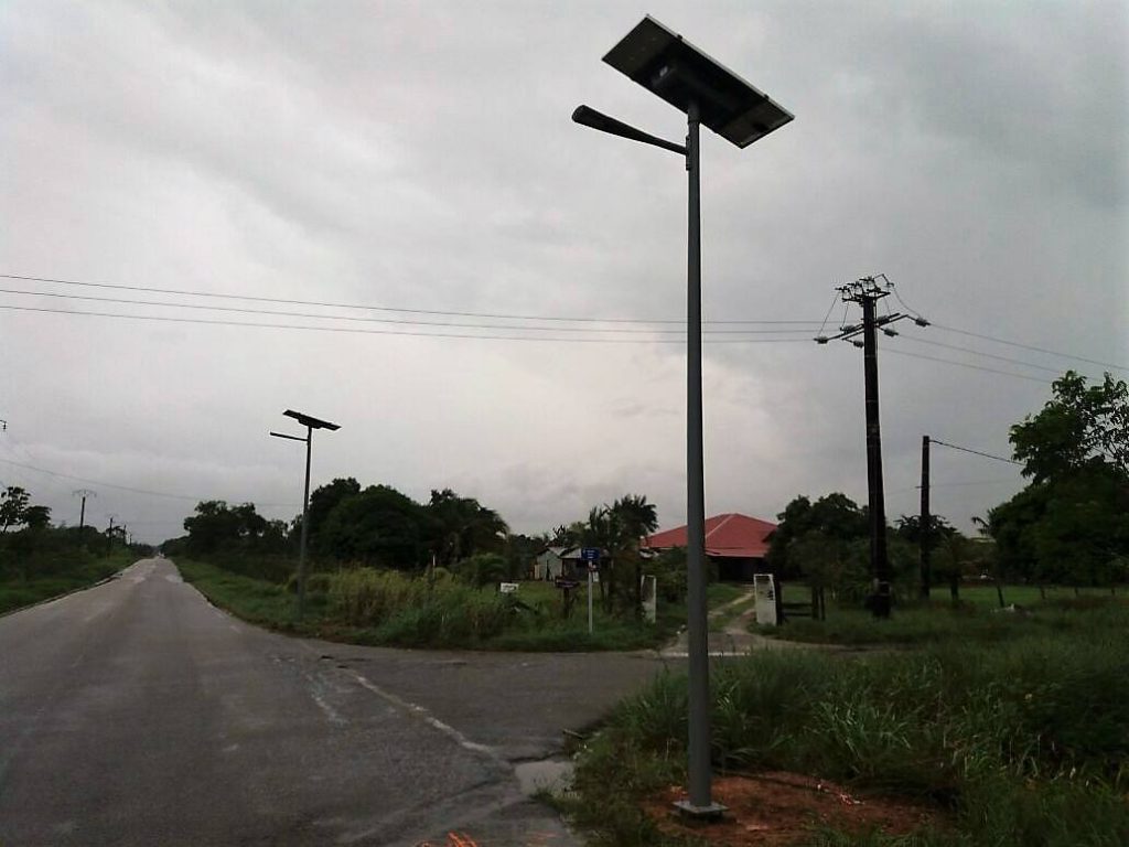 Des candélabres solaires, modèle COMBI TOP 3 GRIFF ont été installés dans la ville de Macouria, une commune française située dans le département de la Guyane.Il était nécessaire d’améliorer la sécurité de la voirie, en apportant des points d’éclairages. En solution traditionnelle électrique câblée il aurait fallu passer en réseau mais cela était trop coûteux. L’objectif de ce projet était de sécuriser la route toute la nuit en limitant les travaux de génie civil et de raccordement électrique. La solution d’éclairage solaire par un lampadaire autonome était la solution technique et économique la plus appropriée. Ce lampadaire autonome est composé d’un panneau solaire photovoltaïque de 160 Wc, d’un parc de batterie de stockage d’énergie de 819 Wh, technologie lithium first assurant une durée de vie de plus de 10 ans et d’une régulation électronique. La technologie Endurance +, développée par Novea, permet, grâce à ses cellules au Lithium LiFePO4 et à sa gestion unique des flux d’énergie, d’offrir la meilleure durée de vie du marché. Les batteries LiFePO4 ont été reconnues scientifiquement comme les plus performantes et les mieux adaptées au marché de l’éclairage public solaire. Concernant le fonctionnement, le luminaire LED COMBI TOP 3 s’allume au crépuscule en pleine puissance pendant 5 heures, puis passe en veille à 30%. Il repasse en pleine puissance pendant 3 heures avant l’aube puis finit par s’éteindre à l’aube. Cette gestion offre à notre lampadaire solaire une grande autonomie et une longue durée de vie de batterie. Le choix de Novéa Energies s’est porté sur la qualité des produits installés ainsi que pour la batterie située en TOP du mât qui permet de prémunir d’éventuels vol dans la région. Informations supplémentaires : Modèle lampadaire solaire : GRIFF S Panneau solaire : 160 Wc Hauteur de feu : 6.0m Capacité batterie : 819 Wh Crosse Ste Maxime RAL Gris 2900 sablé
