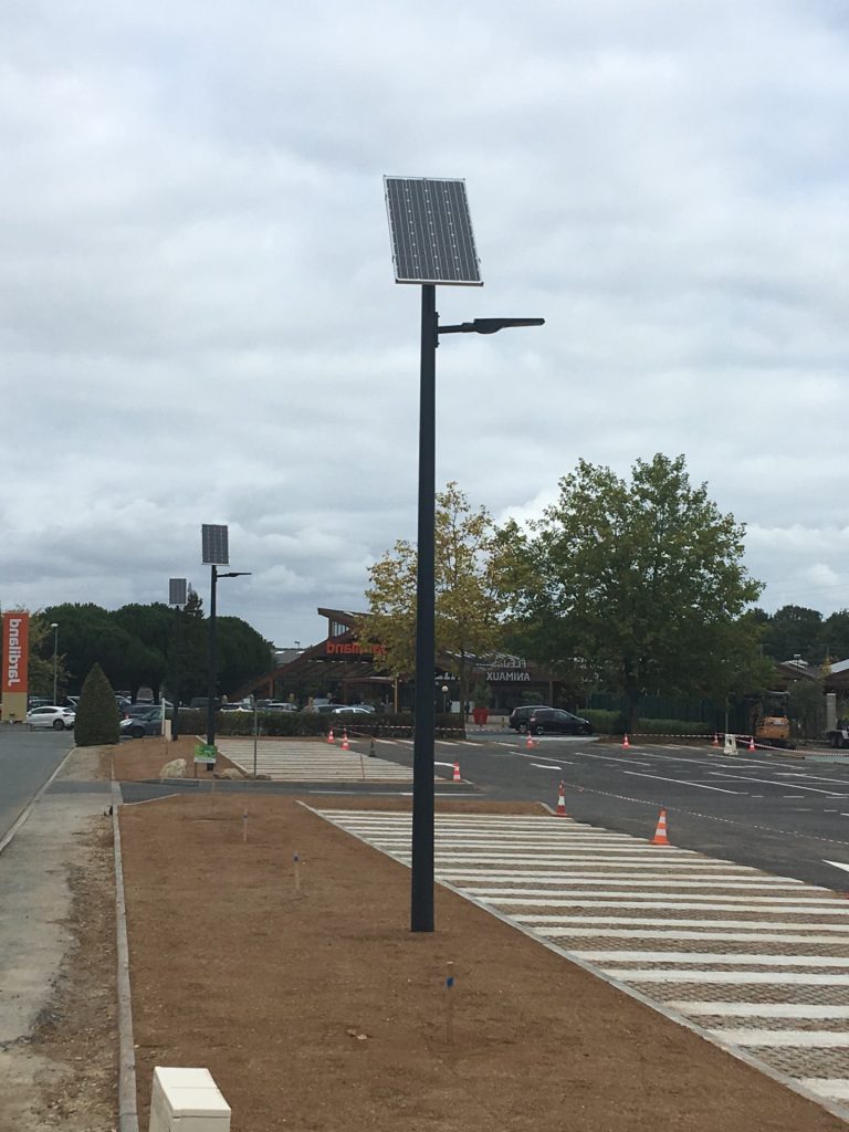 Trois candélabres solaires, modèle COMBI TOP 3 TEKK ont été installés dans la ville de la Roche-sur-Yon, préfecture du département de la Vendée, dans la région des Pays de la Loire. Il était nécessaire d’améliorer la sécurité de ce parking existant sur la zone commerciale à proximité de l’hyper de COOPATLANTIQUE route de Nantes, en apportant des points d’éclairage. En solution traditionnelle électrique câblée il aurait fallu passer par un réseau électrique mais cela était trop couteux. L’objectif de ce projet était donc de sécuriser le parking toute la nuit en limitant les travaux de génie civil et de raccordement électrique. La solution d’éclairage solaire par un lampadaire autonome était la solution technique et économique la plus appropriée. Ce lampadaire autonome est composé d’un panneau solaire photovoltaïque de 150Wc, de la dernière technologie de batterie développée par Novea : Endurance +, d’une capacité énergétique de 819Wh. Cette dernière, offre une durée de vie de plus de 20 ans à la batterie et la carte électronique de gestion. Le lampadaire solaire est équipé de détecteur de présence. Concernant le fonctionnement, le luminaire LED TEKK S s’allume au crépuscule en veille à 2%, puis passe en pleine puissance suite à une détection de présence de 45 secondes. Extinction du candélabre à l’aube. Le mode veille permet de baliser le parking pour qu’il soit vu et qu’il reste accueillant, et le mode pleine puissance par détection de présence infrarouge offre le confort maximum à tout moment de la nuit tout en limitant la consommation énergétique. Cette gestion offre à notre lampadaire solaire une grande autonomie et une longue durée de vie de batterie. La mise en place de ce candélabre autonome a évité les travaux lourds de génie civil (tranchée, réfection de voie) et la mise en place de réseau. Un massif en béton suffit à l’ancrage au sol. L’intégration de cette solution d’éclairage autonome en énergie a donc facilité les travaux d’installation et limiter l’investissement. Informations supplémentaires : Modèle lampadaire solaire : TEKK S Panneau solaire : 150 Wc Hauteur de feu : 5.0m Technologie et capacité batterie : LiFePo4, Endurance + Technology, 819Wh Crosse St Luc RAL 7016