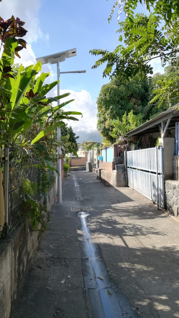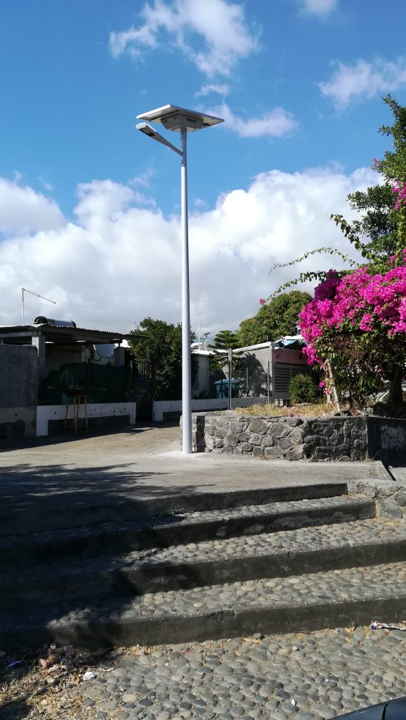 Ce sont 26 candélabres, modèle COMBI TOP 3 GRIFF S qui ont été installés dans la ville du Port, sur l’île de La Réunion. Ce projet a été réalisé dans une résidence HLM où le réseau d’éclairage public était vétuste. Il était très difficile de rénover le réseau compte tenu de la configuration du site (ruelle très étroite, impossible d’amener des engins de chantier traditionnels). Le choix de l’autonome était la solution la plus simple pour répondre au besoin d’éclairage. De plus, la loi sur la transition énergétique et la croissance verte ainsi que le projet de programmation pluriannuelle de l’énergie (PPE Réunion) fixent l’objectif ambitieux de porter la part des énergies renouvelables à 50% d’ici 2020, puis à 100% en 2030 sur l’île. Ce projet intègre parfaitement ce programme. Ces lampadaires autonomes sont composés d’un panneau solaire photovoltaïque de 150Wc, d’un parc de batterie de stockage d’énergie de 32Ah 25,6V, technologie lithium assurant une durée de vie de plus de 10 ans et d’une régulation électronique. Concernant le fonctionnement, le luminaire LED GRIFF S s’allume au crépuscule en pleine puissance pendant 6 heures, puis passe en mode veille à 50% et reprise du fonctionnement en pleine puissance pendant 1 heure avant l’aube. Cette gestion de l’éclairage offre à nos lampadaires solaires une grande autonomie et une longue durée de vie de batterie. [caption id="attachment_2701" align="alignright" width="361"] dav[/caption] Pour le client final et l’installateur, l’autonome avait un intérêt économique et une rapidité de déploiement, compte tenu de la particularité du site. Les produits Novéa ont séduit par leur esthétique, leur performance et la réputation du sérieux de Novéa. Informations supplémentaires : Modèle lampadaire solaire : TOP 3 GRIFF S 16 LED Panneau 150Wc Console Sainte Maxime Hauteur de feu : 5.0m Capacité batterie : Lithium 33Ah 25,6V 3320 lumens Mât cylindroconique acier galvanisé thermolaqué