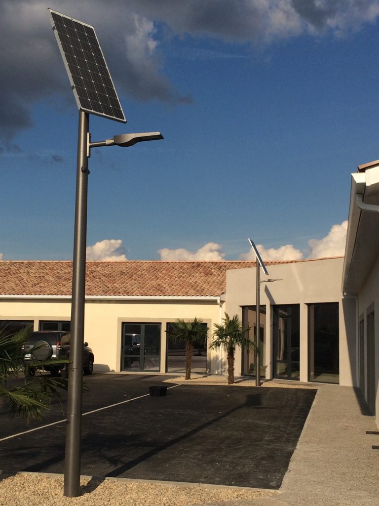 Cette installation a été faite à Cavignac, une commune du Sud-Ouest de la France, située dans le département de la Gironde (33). L’objectif de ce projet était d’éclairer un parking et un chemin piéton de locaux commerciaux.Ne souhaitant pas d’abonnement à un fournisseur d’électricité, pas de consommation, pas d’armoire de commande et ne voulant pas créer un réseau souterrain, la solution d’éclairage solaire par un lampadaire autonome était la solution technique et économique la plus appropriée. De plus, le client, BOUSQUET Immobilier souhaitait une mise en service instantanée dès la pose du candélabre terminée. Le contrat fut rempli puisque nos éclairages autonomes ne nécessitent aucune tranchée, aucun câble, aucun raccordement au réseau ni ajout d’armoire électrique. Un simple ancrage a suffi pour les fixer au sol.Le candélabre COMBI 3 TEKK est composé d’un panneau solaire photovoltaïque de 150Wc, d’un parc de batterie de stockage d’énergie de 15Ah 25,6V, technologie Lithium First assurant une durée de vie de plus de 10 ans et d’une régulation électronique. Le lampadaire solaire est équipé de détecteur de présence infrarouge fixé sur le mât. Concernant le fonctionnement, il y a détection toute la nuit, avec un allumage au crépuscule en veille à 5%. Puis passage en pleine puissance suite à une détection de présence de 45 secondes, jusqu’à l’extinction à l’aube. Cette gestion précise de l’éclairage a permis de proposer des lampadaires solaires compacts et leur offre une grande autonomie et une longue durée de vie des batteries.Informations supplémentaires : Modèle lampadaire solaire : COMBI 3 TEKK 32 LED Panneau solaire 150Wc Capacité batterie : Lithium First 25.6V 15Ah Technologie : Lithium Fer Phosphate Détecteur de présence infrarouge fixé sur le mât Durée de vie 10 ans