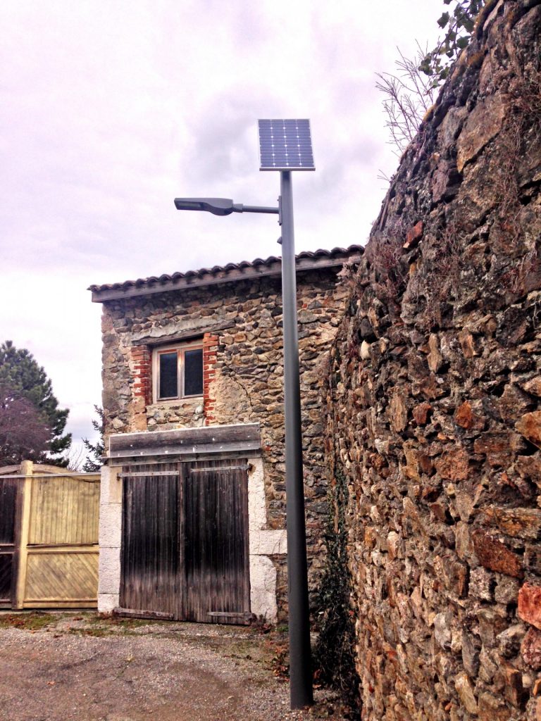 Un candélabre solaire, modèle Combi 2 TEKK a été installé à GLUN, une commune située dans le département de l’Ardèche, dans une impasse. Ce projet a été évoqué lors d’une rencontre avec le Maire de GLUN lors du salon du SDE07 (Syndicat d’Energie de l’Ardèche) en Mai 2016. Ce candélabre a été installé par Eiffage Energie à Valence. Il était nécessaire d’éclairer cette impasse. En solution traditionnelle électrique câblée il aurait fallu réaliser des tranchées et tirer le réseau. L’objectif de ce projet était de sécuriser l’impasse en limitant les travaux de génie civil et de raccordement électrique. La solution d’éclairage solaire par un lampadaire autonome était la solution technique et économique la plus appropriée. Ce lampadaire autonome est composé d’un panneau solaire photovoltaïque de 60Wc, d’un parc de batterie Lithium Premium d’une durée de vie de 20 ans, ainsi qu’un stockage d’énergie de 15Ah 25,6V. Le lampadaire solaire est équipé de détecteur de présence. Concernant le fonctionnement, le luminaire LED TEKK est en mode veille toute la nuit à 10% puis passe en pleine puissance lorsque qu’il y a détection de présence. Le mode veille permet de baliser l’impasse, et le mode pleine puissance par détection de présence infrarouge offre le confort maximum à tout moment de la nuit tout en limitant la consommation énergétique. Cette gestion offre à notre lampadaire solaire une grande autonomie et une longue durée de vie des batteries. Informations supplémentaires : Modèle lampadaire solaire : TEKK 16 LED Hauteur de feu : 4,5m Luminaire LED avec détecteur de présence infrarouge déporté Panneau solaire : 60Wc Batterie : lithium Premium 15Ah 25,6V, durée de vie 20ans