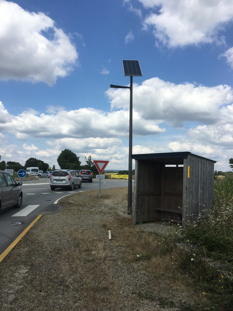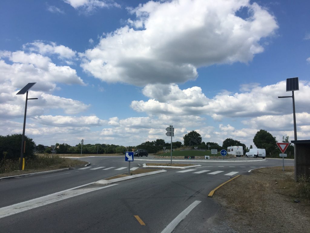 La ville de Theix, dans le Morbihan (56), a opté pour des candélabres solaires Novéa Énergies afin de sécuriser un rond-point aménagé avec un passage piéton et un abribus. Deux COMBI TOP 3 dotés d’un panneau solaire de 160 Wc avec luminaire GRIFF S ont été installés simplement, sans réaliser de lourds travaux de voirie, au giratoire de Lirey (56). En solution traditionnelle électrique câblée, le raccordement au réseau électrique aurait été coûteux. Ces candélabres assurent un éclairage de qualité afin de sécuriser le giratoire. Ils éclairent en pleine puissance durant cinq heures par nuit, soit 2H30 après le crépuscule et 2H30 avant l’aube. Cet éclairage sécurise à la fois le passage piéton, l’arrêt de car existant à cet endroit et l’entrée dans le giratoire. La mise en place de ces candélabres autonomes a permis d’éviter des travaux lourds de génie civil (tranchée, réfection de voie) et la mise en place de réseau. Un massif en béton suffit à l’ancrage au sol. L’intégration de cette solution d’éclairage autonome en énergie a donc facilité les travaux d’installation et limité l’investissement. L’éclairage public alimenté par énergie solaire est également une solution écologique car elle permet de limiter les impacts environnementaux en offrant une alternative à la consommation d’énergies fossiles et polluantes. De plus, le fonctionnement de ces candélabres n’entraîne aucun abonnement électrique au fournisseur d’énergie. Informations supplémentaires : Modèle COMBI TOP 3 Lampadaire : GRIFF S Panneau solaire : 150 Wc Hauteur de feu : 5.0 m Technologie et capacité batterie : ENDURANCE + TECHNOLOGY 345 Wh Crosse : Sainte Maxime RAL : 2900 Merci à nos partenaires B-Light Ouest, Engie Ineo et Morbihan Énergies pour la réalisation de ce projet d’ensembles autonomes !