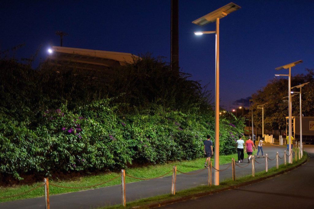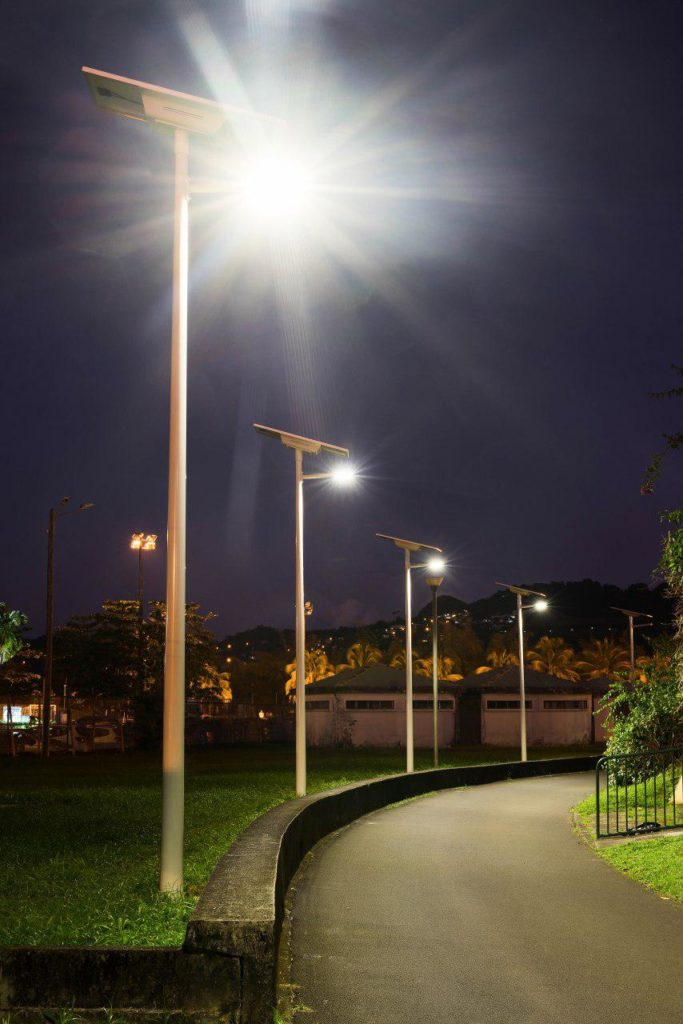 Près de soixante-dix lampadaires Novéa Énergies ont été installés aux alentours du stade Georges Gratiant, dans la ville du Lamentin, en Martinique (972). Ce stade, qui est le deuxième plus grand stade de la Martinique, est désormais sécurisé par l’éclairage solaire de soixante-six COMBI TOP 3 GRIFF S et trois COMBI TOP 5 GRIFF S. L’éclairage prodigué par ces candélabres permet d’assurer le confort et la sécurité des usagers aux abords du stade. Ils peuvent ainsi assister aux événements sportifs sans se soucier de la tombée de la nuit. Ils peuvent ainsi quitter le stade ou regagner leur véhicule en toute sécurité et avec le confort de la lumière. Les soixante-six COMBI TOP 3 sont dotés d’un panneau photovoltaïque solaire de 160 Wc positionné en tête de mât, et d’une batterie (stockée sous le panneau solaire) de 819 Wh. Les trois COMBI TOP 5 sont quant à eux dotés d’un panneau solaire de 295 Wc et d’une batterie de 1 408 Wh. Les luminaires Ragni qui équipent l’ensemble de ces lampadaires, tous d’une hauteur de feu de 5 mètres, sont des Griff S. La couleur choisie pour ces ensembles est le RAL 9002, blanc gris. Les lampadaires éclairent en pleine puissance durant les quatre heures suivant le crépuscule, puis ils passent en mode abaissement pour assurer un balisage des abords du stade et de la piste d’athlétisme durant toute la nuit, grâce à une veille à 20 % et un système de détection de présence permettant de repasser en pleine puissance lorsqu’un usager en a besoin. La solution d’éclairage autonome était la plus adaptée à cette installation, car sa mise en place ne nécessitait pas de réaliser de lourds travaux (tranchée, réfection de voie…) contrairement à l’éclairage traditionnel raccordé réseau, mais seulement un massif béton pour son ancrage au sol. Cela permettait donc une mise en place simplifiée, sans générer de perturbation pour les événements sportifs se déroulant au stade. De plus, aucun abonnement à un fournisseur d’électricité n’est requis, ce qui rend cette solution totalement autonome. L’éclairage solaire dispose également d’un avantage écologique, car il s’agit d’une solution alternative à la consommation d’énergies fossiles, qui permet donc de limiter les impacts environnementaux de l’éclairage public. Les lampadaires solaires Novéa Énergies sont équipés de batteries dotées de la technologie Endurance +, développée au terme de 6 ans de Recherche et développement en partenariat avec le laboratoire de stockage de l’énergie du C.E.A. (Commissariat à l’Énergie Atomique) de Grenoble. Nos batteries au Lithium Fer Phosphate offrent la durée de vie la plus longue du marché, (plus de 22 ans dans la limite d’une perte de capacité globale de 20 %), ce qui signifie moins de remplacement de composants, donc moins de production et de gestion de déchets et ainsi un impact limité sur l’environnement. Les candélabres Novéa Énergies sont agréés EN40, et parfaitement dimensionnés pour les zones cycloniques telles que la Martinique. Nous réalisons une étude mécanique qui garantit une installation sûre du candélabre et de son maintien dans le temps car la prise au vent du panneau solaire et son poids nous obligent à étudier précisément la tenue mécanique de l’ensemble. Nous réalisons des notes de calcul des mâts et des massifs béton ; en prenant en compte le modèle du candélabre solaire, la zone géographique et la nature du sol ; afin de valider la tenue mécanique du mât selon la zone de vent du lieu d’installation et son ancrage dans le sol. Informations supplémentaires : Modèle autonome COMBI TOP 3 Panneau solaire : 160 Wc Technologie et capacité batterie : ENDURANCE + TECHNOLOGY 819 Wh Lampadaire : GRIFF S Hauteur de feu : 5.0 m Crosse : m/cp RAL 9002 Blanc gris Modèle autonome COMBI TOP 5 Panneau solaire : 295 Wc Technologie et capacité batterie : ENDURANCE + TECHNOLOGY 1 408 Wh Lampadaire : GRIFF S Hauteur de feu : 5.0 m Crosse : m/cp RAL 9002 Blanc gris