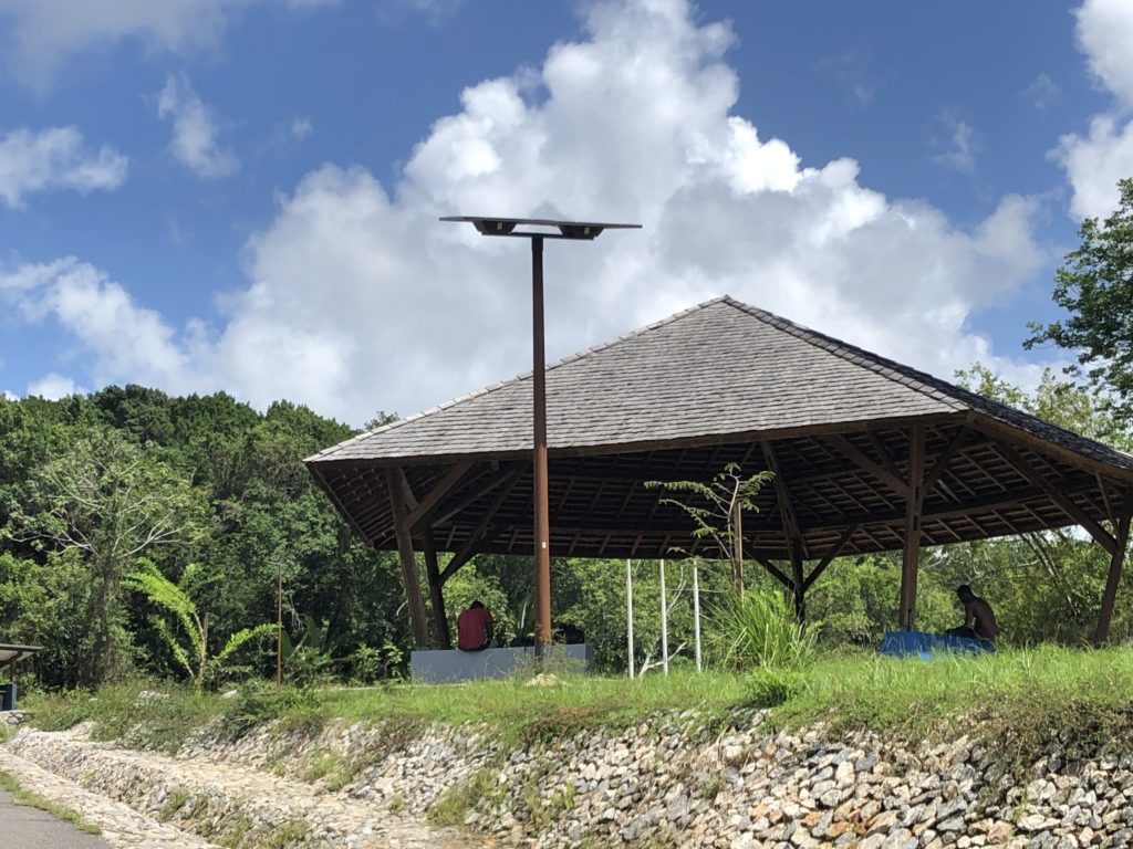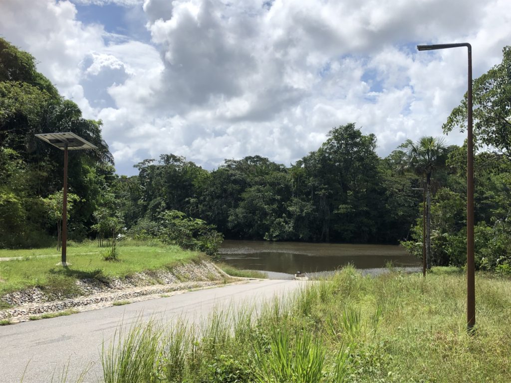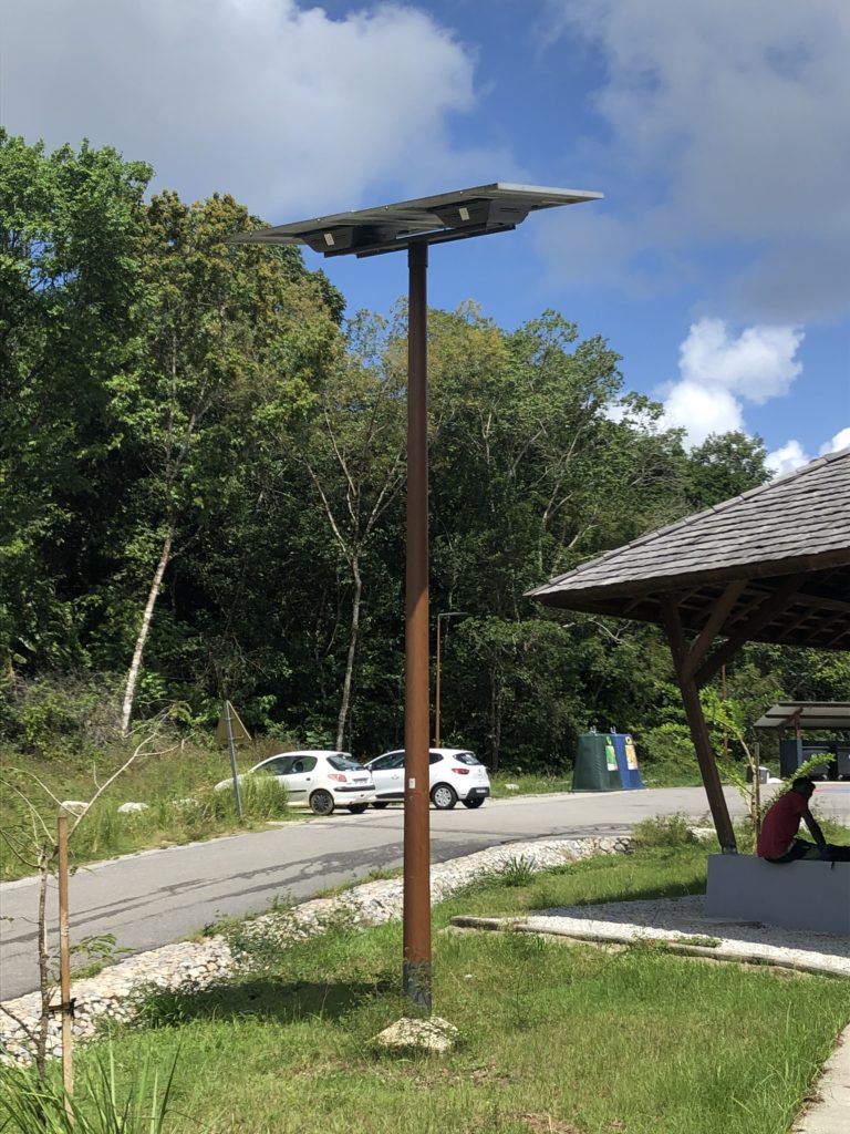 Le débarcadère du PK21 situé à la fin de la route du Dégrad Saramaca, en Guyane (973), est le point d’accès central du fleuve Kourou. Les pêcheurs, les habitants du bord du fleuve, ceux qui viennent séjourner dans des carbets fréquentent ce débarcadère. Suite à des travaux de rénovation, il est désormais sécurisé par l'éclairage autonome solaire Novéa Énergies. Début 2019, le débarcadère a été totalement rénové et modernisé. Les travaux effectués permettent de faciliter l’accès des embarcations au fleuve Kourou. La rampe d’accès à l’eau et le parking ont été redimensionnés afin de permettre aux pirogues d’embarquer et débarquer facilement, quelle que soit leur taille. Pour apporter du confort aux usagers, un carbet et cinq bancs ont été installés, et surtout de l’éclairage a été installé pour sécuriser le parking, le carbet, l’espace poubelle et le débarcadère. La solution choisie pour l’éclairage du PK21 est une solution autonome solaire Novéa Énergies : la solution MULTI. Une centrale MULTI TOP 6 est installée auprès du carbet afin d’alimenter deux luminaires GRIFF S en appliques latérales pour éclairer le carbet et huit lampadaires équipés de luminaires GRIFF S en top de mâts pour les autres zones du PK21. La centrale productrice d’énergie solaire MULTI TOP 6 est dotée d’un panneau solaire photovoltaïque de 2 x 260 Wc incliné à 15° sur un mât de cinq mètres, et d’une batterie de 1 408 Wh en haut du mât. L’ensemble des équipements techniques sont situés sous le panneau solaire, afin d’éviter les risques d’inondation ou de vandalisme. Les lampadaires reliés à cette centrale solaire sont des luminaires GRIFF S de la gamme RAGNI. Huit sont positionnés en top de mâts de cinq mètres et deux sont positionnés sur des appliques murales. Les mâts de la centrale solaire et des luminaires GRIFF S arborent une finition bois Kentucky, afin de se fondre au mieux dans le paysage boisé et naturel du débarcadère PK21. L’ensemble des luminaires s’allument en pleine puissance durant trois heures à partir du crépuscule. Le reste de la nuit, les dix luminaires assurent le balisage des différentes zones du PK21 grâce à une veille de 20 %. Un système de détection de présence est associé à ce mode abaissement afin de basculer les luminaires en pleine puissance dès qu’un usager en a besoin. Ce programme permet d’avoir un éclairage adapté au besoin, assurant la sécurité et le confort des usagers sans éclairer en pleine puissance toute la nuit et ainsi protéger la faune et la flore. Le système de centrale solaire MULTI proposé par Novéa Énergies est une solution innovante et simple à mettre en œuvre, qui permet de déporter la production d´énergie à distance des points lumineux, ici les luminaires GRIFF S sur mâts ou en applique. L’énergie solaire est transmise de la centrale aux luminaires à l’aide d’un réseau très basse tension (24 Volts) qui permet de simplifier les travaux de génie civil en comparaison à l’éclairage traditionnel câblé qui nécessite un réseau 220 V. Le fonctionnement de ces lampadaires solaires n’entraîne ainsi aucun abonnement électrique à un fournisseur d’énergie, car ils fonctionnent grâce à l’énergie solaire développée par la centrale, ici MULTI TOP 6. Cette solution d’éclairage autonome en énergie permet d’offrir un confort lumineux et la sécurité des usagers tout en limitant l’impact environnemental de l’éclairage public. La solution MULTI est surtout appréciée pour son aspect esthétique, du fait que la source de production et de gestion de l’énergie soit mutualisée sur un seul point. Cette solution est également adaptée aux lieux où la végétation est très présente, car la centrale permet de pallier les difficultés d’ombrage et en apports solaires que cela génère. Informations supplémentaires : Modèle centrale solaire MULTI TOP 6 Panneau solaire : 2 x 260 Wc Technologie et capacité batterie : ENDURANCE + TECHNOLOGY 1 408 Wh Mât : 5 m sublimation bois Kentucky Luminaire sur mât : GRIFF S RAL luminaire : gris 2900 sablé RAL mât : sublimation bois Kentucky Hauteur de feu : 5.0 m Luminaire en applique : GRIFF S RAL gris 2900 sablé
