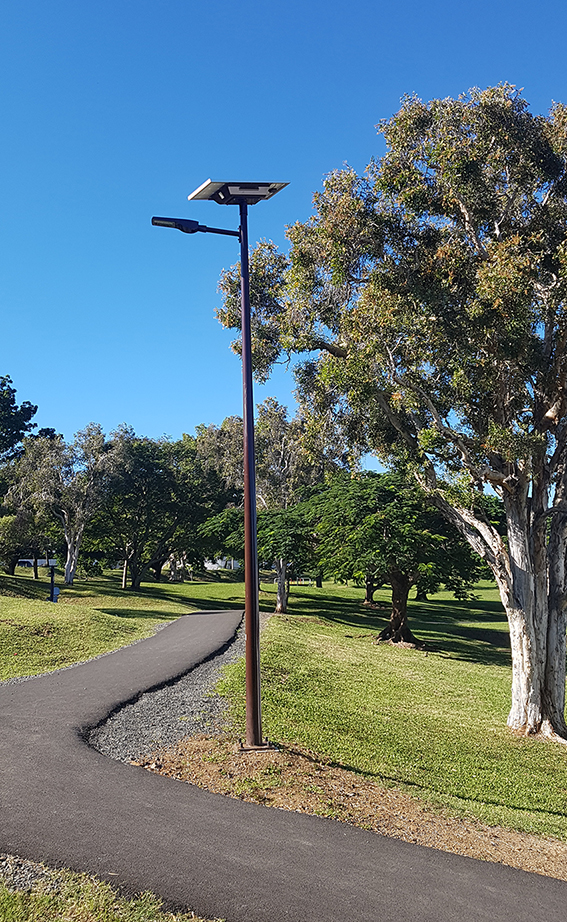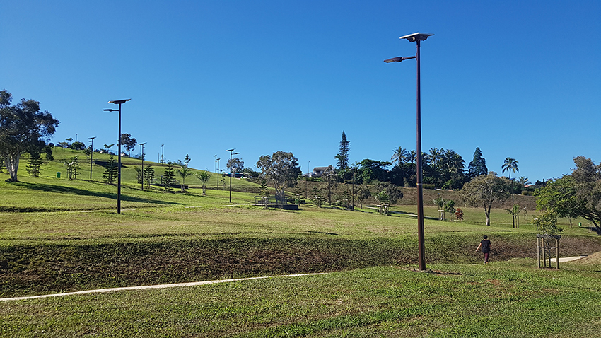 La ville de Dumbéa est située aux portes de la capitale Nouméa, en bord de mer. Elle propose deux beaux espaces verts aux habitants : le parcours Serge Agathe Nerine et le parcours du cœur. Ces deux espaces sont éclairés par les candélabres solaires Novéa. Le parcours Serge Agathe Nerine (anciennement le Croissant Vert), a été doté de 27 ensembles solaires couleurs chocolat, conçus et dimensionnés pour répondre aux habitudes des usagers. Le parcours du cœur est situé un peu plus loin, en contre-bas de la mairie, et propose un sentier de 700m tourné cardio, accessible aussi bien aux sportifs qu’aux familles. Il est éclairé par 34 lampadaires autonomes identiques au premier parcours, les besoins étant similaires. Mais quelles sont les habitudes dans ce parc ? De nombreux publics s’y retrouvent pour leurs loisirs, tout au long de la journée et de la soirée. Il fallait donc une solution pouvant offrir un éclairage performant pendant 5h après le coucher du soleil. Puis le choix a été fait de sécuriser les espaces en gardant, tout au long de la nuit, un éclairage à 40% de sa capacité. Novéa a ensuite procédé aux trois études complémentaires pour dimensionner le projet au plus juste. L’ensoleillement de la zone étant important, nous avons pu proposer un modèle COMBI TOP 2, avec un panneau solaire de 100 Wc et une batterie ENDURANCE + TECHNOLOGY de 532 Wh. Cette composition est la plus ajustée pour répondre à la programmation voulue, avec une gestion d’énergie optimisée, et un rapport qualité-prix au plus juste. Une fois l’aspect technique dimensionné au plus près du besoin, nous nous sommes intéressés au design du produit avec les finitions. Les lampadaires solaires sont ainsi équipés de luminaire TEKK S de l’entreprise Ragni (dont Novea est une filiale), des incontournables dans l’éclairage public, et sont habillés d’un joli RAL chocolat, pour se fondre totalement dans le paysage du parc. Enfin, pour assurer la durabilité du produit, les mâts (dimensionnés selon la norme EN40 pour les zones cycloniques) ont bénéficié d’un traitement bord de mer doublé d’un thermolaquage. Le traitement consiste à ajouter un revêtement époxy ultrarésistant qui protège durablement les pièces métalliques contre la corrosion. Puis le thermolaquage rajoute une protection solide contre les intempéries et les rayons UV. La solution a donc été définie, des caractéristiques techniques au design, pour répondre au plus juste à la demande la ville. Elle propose des candélabres solaires durables et esthétiques qui ont trouvé rapidement leur place au sein des parcs de la ville. Merci à notre partenaire local, société Lumelec, pour le parfait suivi du dossier : de la qualification du besoin, jusqu’à la livraison. Informations supplémentaires : Modèle COMBI TOP 2 Hauteur de feu 6.0 m RAL 8017 chocolat Luminaire TEKK S Durée de vie > 100 000 h 80 % du flux Panneau solaire 100 Wc Durée de vie > 25 ans Technologie et capacité batterie ENDURANCE + TECHNOLOGY 532 Wh Durée de vie > 20 ans Garantie 10 ans