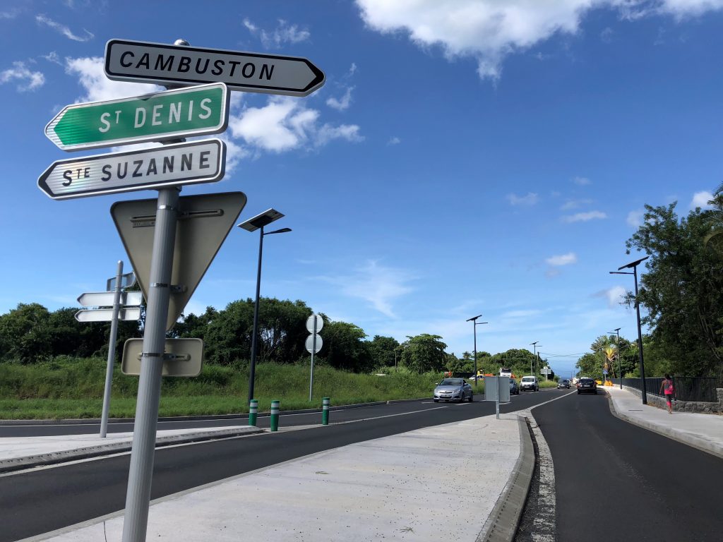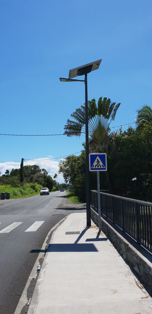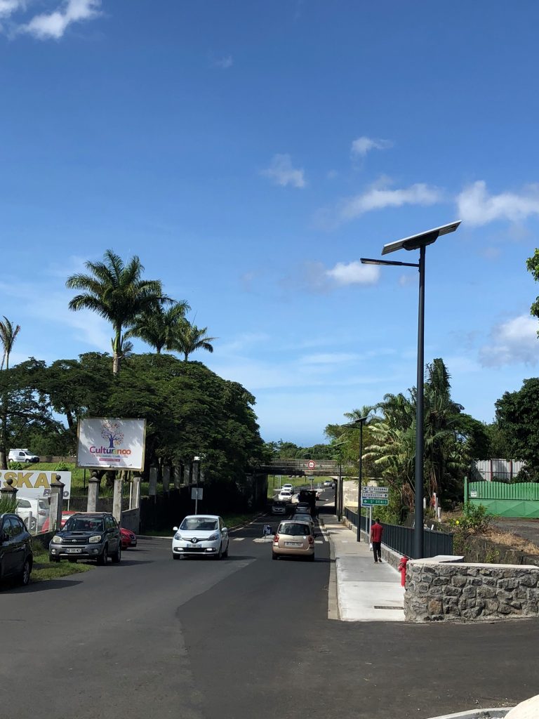 13 candélabres solaires autonomes, modèle COMBI TOP 5 GRIFF XL ont été installés dans la ville de Saint-André, une commune française d’outre-mer, située dans le département de La Réunion.Il était nécessaire d’améliorer la sécurité de la voirie, en apportant des points d’éclairage. En solution traditionnelle électrique câblée il aurait fallu passer en réseau mais cela était trop couteux. L’objectif de ce projet était de sécuriser la route toute la nuit en limitant les travaux de génie civil et de raccordement électrique. La solution d’éclairage solaire par un lampadaire autonome était la solution technique et économique la plus appropriée. Ces lampadaires autonomes sont composés d’un panneau solaire photovoltaïque de 270Wc, d’un parc de batterie de stockage d’énergie de 1 638 Wh, technologie lithium Endurance + assurant une durée de vie de plus de 10 ans et d’une régulation électronique. La technologie Endurance+, développée par Novea, permet, grâce à ses cellules au Lithium LiFePO4 et à sa gestion unique des flux d’énergie, d’offrir la meilleure durée de vie du marché. Les batteries LiFePO4 ont été reconnues scientifiquement comme les plus performantes et les mieux adaptées au marché de l’éclairage public solaire. Concernant le fonctionnement, le luminaire LED GRIFF XL s’allume au crépuscule en pleine puissance pendant 5 heures, puis passe en veille à 50%. Il repasse en pleine puissance pendant 2 heures avant l’aube puis s’éteint automatiquement à l’aube. Cette gestion offre à notre lampadaire solaire une grande autonomie et une longue durée de vie de batterie. Le choix de Novéa Energies s’est porté sur la qualité des produits installés. Informations supplémentaires : Modèle lampadaire solaire : COMBI TOP 5, 32 LED Luminaire : GRIFF XL Puissance d’éclairage : 50W Hauteur de feu : 7.0m Crosse St Luc RAL 7016