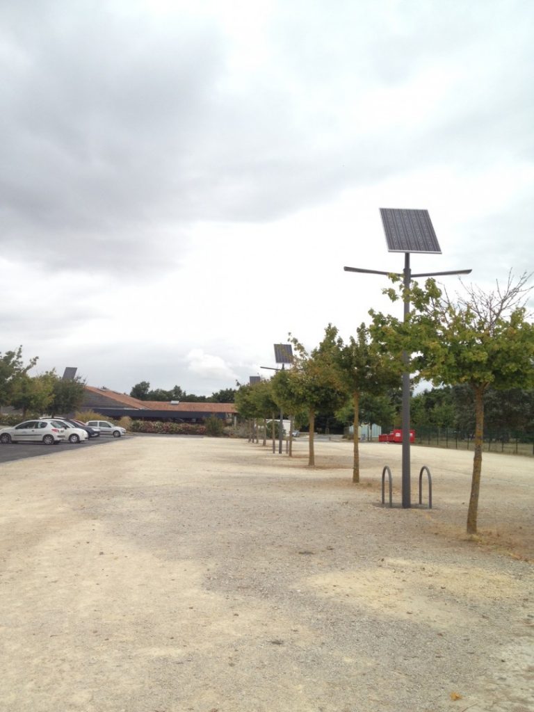 Sept candélabres solaires, modèles Combi Top 5 GRIFF simple et double feu ont été installés à Mignaloux-Beauvoir (86), une commune proche de Poitiers, sur un parking proche de la Salle des fêtes de Magnals. Cette installation a été proposée et pilotée par La SOREGIES, qui a en charge la gestion de l’éclairage public de la commune. Il était nécessaire d’améliorer la sécurité de ce parking très utilisé, par une nouvelle solution d’éclairage. En solution traditionnelle électrique câblée il aurait fallu changer tout le réseau. L’objectif de ce projet était de sécuriser le parking toute la nuit en limitant les travaux de génie civil et de raccordement électrique. La solution d’éclairage solaire par un lampadaire autonome était la solution technique et économique la plus appropriée. Ce lampadaire autonome est composé d’un panneau solaire photovoltaïque de 270 Wc, d’un parc de batterie de stockage d’énergie de 55 Ah 25,6 V, technologie lithium assurant une durée de vie de plus de 10 ans et d’une régulation électronique. Le lampadaire solaire est équipé de détecteur de présence. Concernant le fonctionnement, les luminaires LED GRIFF s’allument en pleine puissance pendant 4 h au crépuscule. Après ce fonctionnement le produit passe en mode veille avec détection de présence, pour une durée totale de 6h en pleine puissance, par nuit. Le mode veille permet de baliser le parking pour qu’il soit vu et qu’il reste accueillant, et le mode pleine puissance par détection de présence infrarouge offre le confort maximum à tout moment de la nuit tout en limitant la consommation énergétique. Cette gestion offre à nos lampadaires solaires une grande autonomie et une longue durée de vie des batteries. La mise en place de ces candélabres autonomes a évité les travaux lourds de génie civil (tranchée, réfection de voie) et la mise en place de réseau. Un massif en béton suffit à l’ancrage au sol. L’intégration de ces solutions d’éclairage autonome en énergie ont donc facilité les travaux d’installation et limiter l’investissement. C’est également l’occasion pour la mairie et la SOREGIES, d’affirmer leur politique d’économie d’énergie et d’usage des énergies renouvelables. Informations supplémentaires : Modèle lampadaire solaire : GRIFF Hauteur de feu : 4.5 m Capacité batterie : Lithium 55 Ah 25,6 V, situées derrière le panneau solaire dans un caisson ventilé Luminaire LED avec deux détecteurs de présence infrarouge déporté Fonctionnement : 4 h en pleine puissance au crépuscule puis passage en veille et détection pour un total de 6 h en pleine puissance par nuit, extinction à l’aube Autonomie : 5 jours sans apport énergétique Mât cylindroconique Top ø89 acier galvanisé thermolaqué