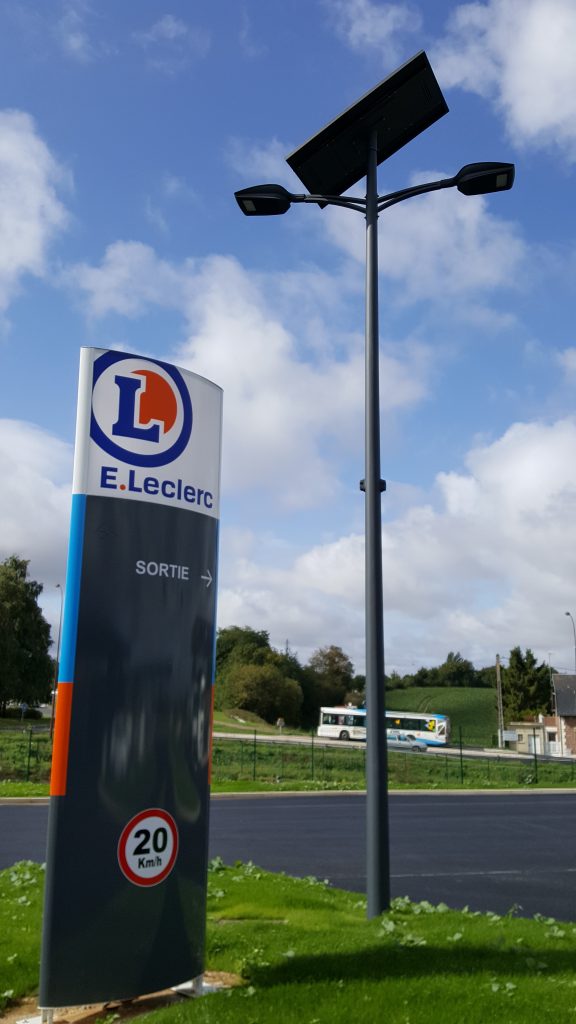 Dans le cadre de la création d’une nouvelle station-service, la société CONTOYDIS, centre distributeur de l’enseigne E. LECLERC a souhaité limiter l’impact environnemental de l’établissement.En réponse aux exigences d’un label HQE (Hygiène Qualité Environnement), notre système d’éclairage solaire ENOA a permis de faire de ce projet un site à énergie positive en optimisant les réseaux électriques en place.Le principe de ce système est simple : pendant la journée, le candélabre produit de l’énergie. Au lieu d’être stockée dans des batteries, l’énergie photovoltaïque est instantanément réinjectée sous forme d’électricité dans l’environnement, par exemple dans un bâtiment à proximité. La nuit, le candélabre fonctionne normalement, en s’alimentant grâce au réseau électrique conventionnel. Pour résumer, au lieu de consommer, et parfois à perte, de l’électricité, l’éclairage public devient producteur d’énergie. De plus sur ce site, la consommation de l’éclairage a été largement optimisée puisque chaque lampadaire est équipé d’un détecteur de présence permettant d’activer la pleine puissance d’éclairage uniquement au passage d’un usager. Ces détecteurs communicants entre eux permettent un allumage instantané de plusieurs points lumineux qui sont regroupés par zone. S’il n’y a personne un mode de fonctionnement à 10% de la puissance maximale est activé pour assurer un balisage. Bilan énergétique de l’installation: Les lampadaires produisent 3 fois plus d’énergie que ce que consommeront les luminaires 107 700 kWh d’énergie produite gratuitement pour le site. Soit une économie sur la facture énergétique estimée à 21 000 € ENOA est le premier candélabre d’éclairage public à participer à la production d’énergie renouvelable. Avec cette innovation, l’éclairage public devient une source importante de production d’énergie verte et un acteur de la transition énergétique. La lumière est valorisée : sécurité et confort la nuit, production d’énergie le jour. Bien dimensionné, ENOA produit 3 fois plus d’énergie que ce qu’il consomme. L’éclairage public représente 30% des dépenses électriques d’une commune. ENOA peut donc compenser une bonne partie de la consommation énergétique de la ville. Le client bénéficie d’une production d’énergie renouvelable locale sans emprise supplémentaire au sol ou sur toiture. Sa facture énergétique est largement diminuée. Il peut soit produire l’énergie pour son propre bâtiment, ou la revendre au fournisseur d’énergie. Avec ENOA, NOVEA ENERGIES marque un pas important dans le domaine des technologies vertes. Un secteur pointé comme l’un des postes de dépenses les plus importants devient désormais producteur. Ainsi, les industries, les écoles, les stations-services ou les hôpitaux se concentrent sur l’usage de l’énergie produite et de la lumière, au lieu de choisir un simple luminaire. Nouvel outil pour le GROUPE RAGNI, qui a fait de « l’éclairage raisonné » sa ligne directrice.
