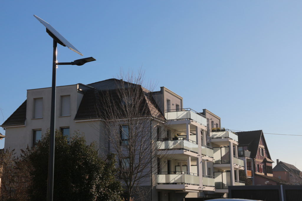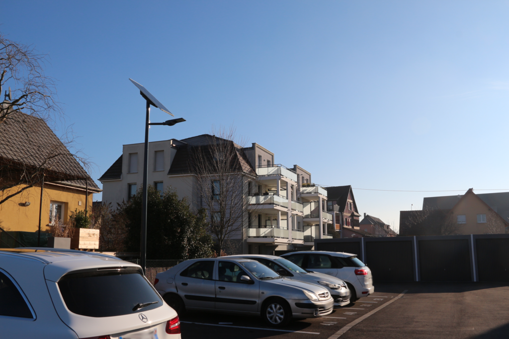 Le lotissement neuf Appart Home à Ebersheim, dans le Bas-Rhin (67), est désormais sécurisé par des candélabres solaires Novéa Énergies. Ces lampadaires solaires éclairent les places de parking réservées aux résidents et une allée piétonne. Ces lampadaires ont été choisis pour leur aspect innovant et écologique, en cohérence avec cette nouvelle résidence. Deux COMBI TOP 3 dotés d’un panneau solaire de 160 Wc avec luminaire TEKK S ont été installés autour de ce lotissement. Le choix de l’autonome alimenté par énergie solaire s’est fait naturellement pour son aspect durable. En effet, cette solution écologique permet de limiter les impacts environnementaux en offrant une alternative à la consommation d’énergies fossiles et polluantes. L’autre avantage est que grâce à leur batterie de 819 Wh et leur système de gestion de l’énergie, ces candélabres sont totalement autonomes, ils ne requièrent donc aucun abonnement électrique à un fournisseur d’énergie. Ces candélabres assurent un éclairage de qualité afin de sécuriser la voie piétonne et les emplacements de stationnement. Les lampadaires autonomes fonctionnent avec un système de veille et détection de présence tout au long de la nuit. La fréquentation et le passage étant limités aux alentours de ce lotissement, il n’est pas nécessaire d’éclairer en pleine puissance durant toute la nuit, c’est pourquoi ces deux lampadaires sont réglés au besoin en ne s’allumant en pleine puissance que lorsqu’un usager est détecté. Lorsqu’aucun usager n’est présent, le mode abaissement à 10 % assure un balisage des zones. Cet éclairage sécurise à la fois le chemin piéton et les places de stationnement et apportent un confort non négligeable aux riverains. Un massif en béton suffit à l’ancrage au sol. Cette solution d’éclairage autonome en énergie est simple d’installation et permet de réduire l’impact environnemental tout en conservant un confort lumineux et une sécurité nocturne. Informations supplémentaires : Modèle COMBI TOP 3 Lampadaire : TEKK S Panneau solaire : 160 Wc Hauteur de feu : 5.0 m Technologie et capacité batterie : ENDURANCE + TECHNOLOGY 819 Wh Crosse : Saint Luc 50 RAL 7016 Merci à notre partenaire Atout Lumière pour l’installation de ces ensembles autonomes !