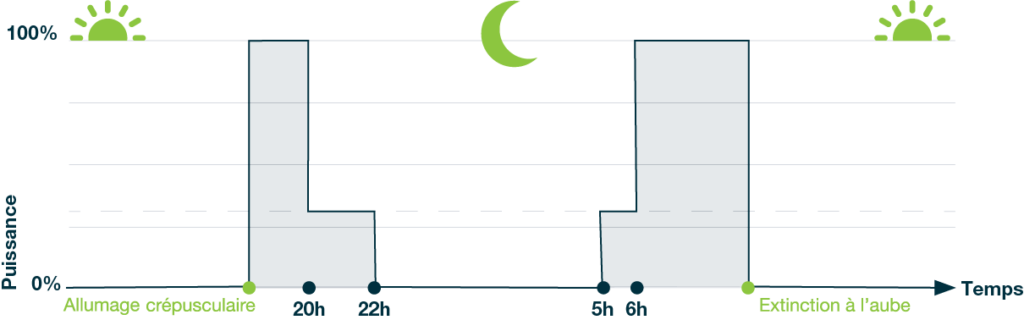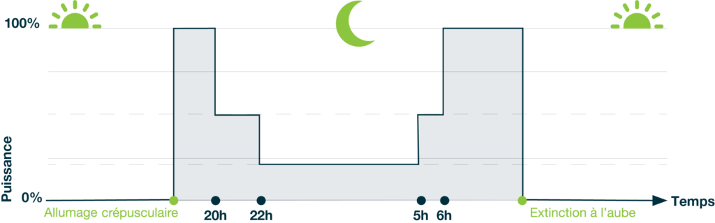 Selon la fréquentation de l’axe, l’éclairage peut être diminué voir éteint une partie de la nuit.